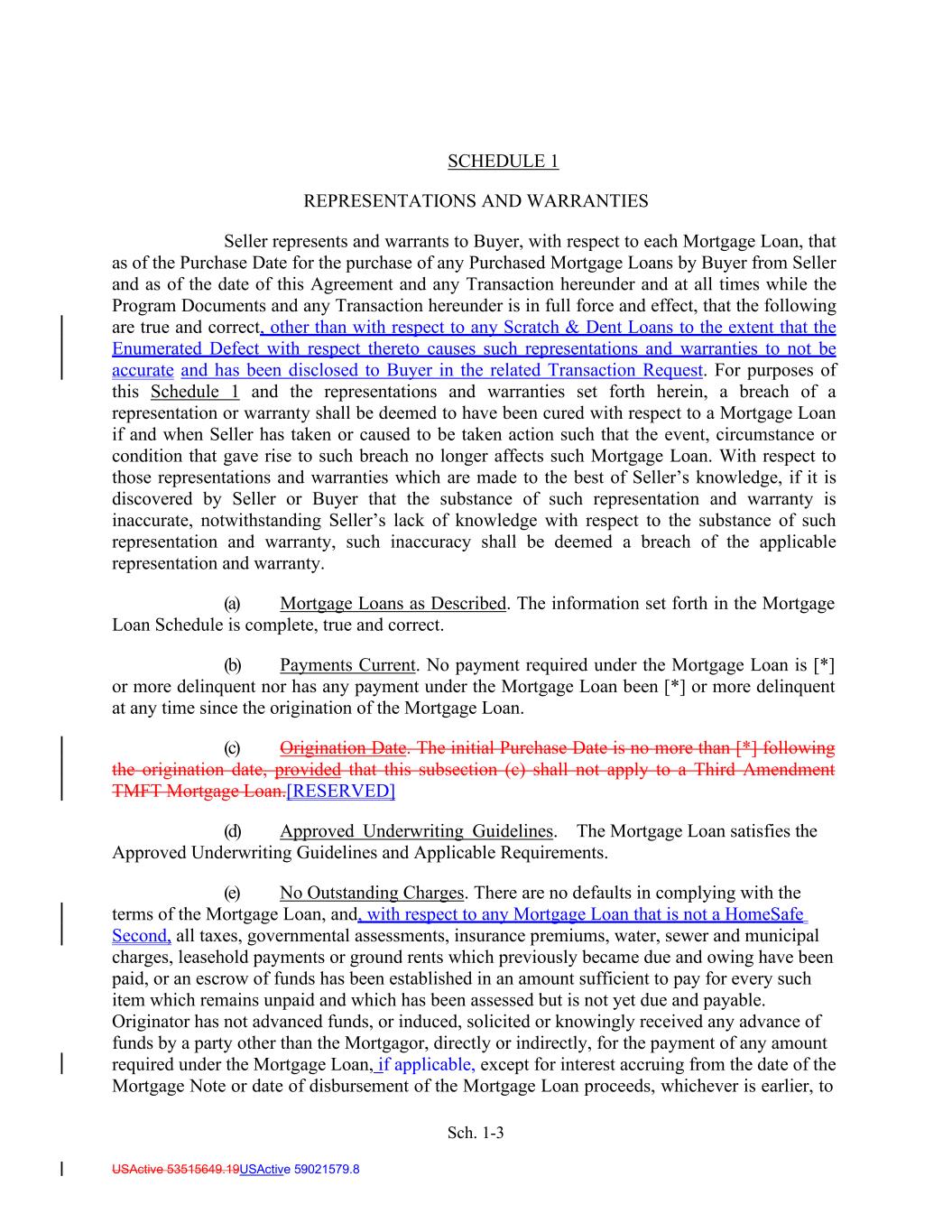 Sch. 1-3 USActive 53515649.19USActive 59021579.8 SCHEDULE 1 REPRESENTATIONS AND WARRANTIES Seller represents and warrants to Buyer, with respect to each Mortgage Loan, that as of the Purchase Date for the purchase of any Purchased Mortgage Loans by Buyer from Seller and as of the date of this Agreement and any Transaction hereunder and at all times while the Program Documents and any Transaction hereunder is in full force and effect, that the following are true and correct, other than with respect to any Scratch & Dent Loans to the extent that the Enumerated Defect with respect thereto causes such representations and warranties to not be accurate and has been disclosed to Buyer in the related Transaction Request. For purposes of this Schedule 1 and the representations and warranties set forth herein, a breach of a representation or warranty shall be deemed to have been cured with respect to a Mortgage Loan if and when Seller has taken or caused to be taken action such that the event, circumstance or condition that gave rise to such breach no longer affects such Mortgage Loan. With respect to those representations and warranties which are made to the best of Seller’s knowledge, if it is discovered by Seller or Buyer that the substance of such representation and warranty is inaccurate, notwithstanding Seller’s lack of knowledge with respect to the substance of such representation and warranty, such inaccuracy shall be deemed a breach of the applicable representation and warranty. (a) Mortgage Loans as Described. The information set forth in the Mortgage Loan Schedule is complete, true and correct. (b) Payments Current. No payment required under the Mortgage Loan is [*] or more delinquent nor has any payment under the Mortgage Loan been [*] or more delinquent at any time since the origination of the Mortgage Loan. (c) Origination Date. The initial Purchase Date is no more than [*] following the origination date, provided that this subsection (c) shall not apply to a Third Amendment TMFT Mortgage Loan.[RESERVED] (d) Approved Underwriting Guidelines. The Mortgage Loan satisfies the Approved Underwriting Guidelines and Applicable Requirements. (e) No Outstanding Charges. There are no defaults in complying with the terms of the Mortgage Loan, and, with respect to any Mortgage Loan that is not a HomeSafe Second, all taxes, governmental assessments, insurance premiums, water, sewer and municipal charges, leasehold payments or ground rents which previously became due and owing have been paid, or an escrow of funds has been established in an amount sufficient to pay for every such item which remains unpaid and which has been assessed but is not yet due and payable. Originator has not advanced funds, or induced, solicited or knowingly received any advance of funds by a party other than the Mortgagor, directly or indirectly, for the payment of any amount required under the Mortgage Loan, if applicable, except for interest accruing from the date of the Mortgage Note or date of disbursement of the Mortgage Loan proceeds, whichever is earlier, to