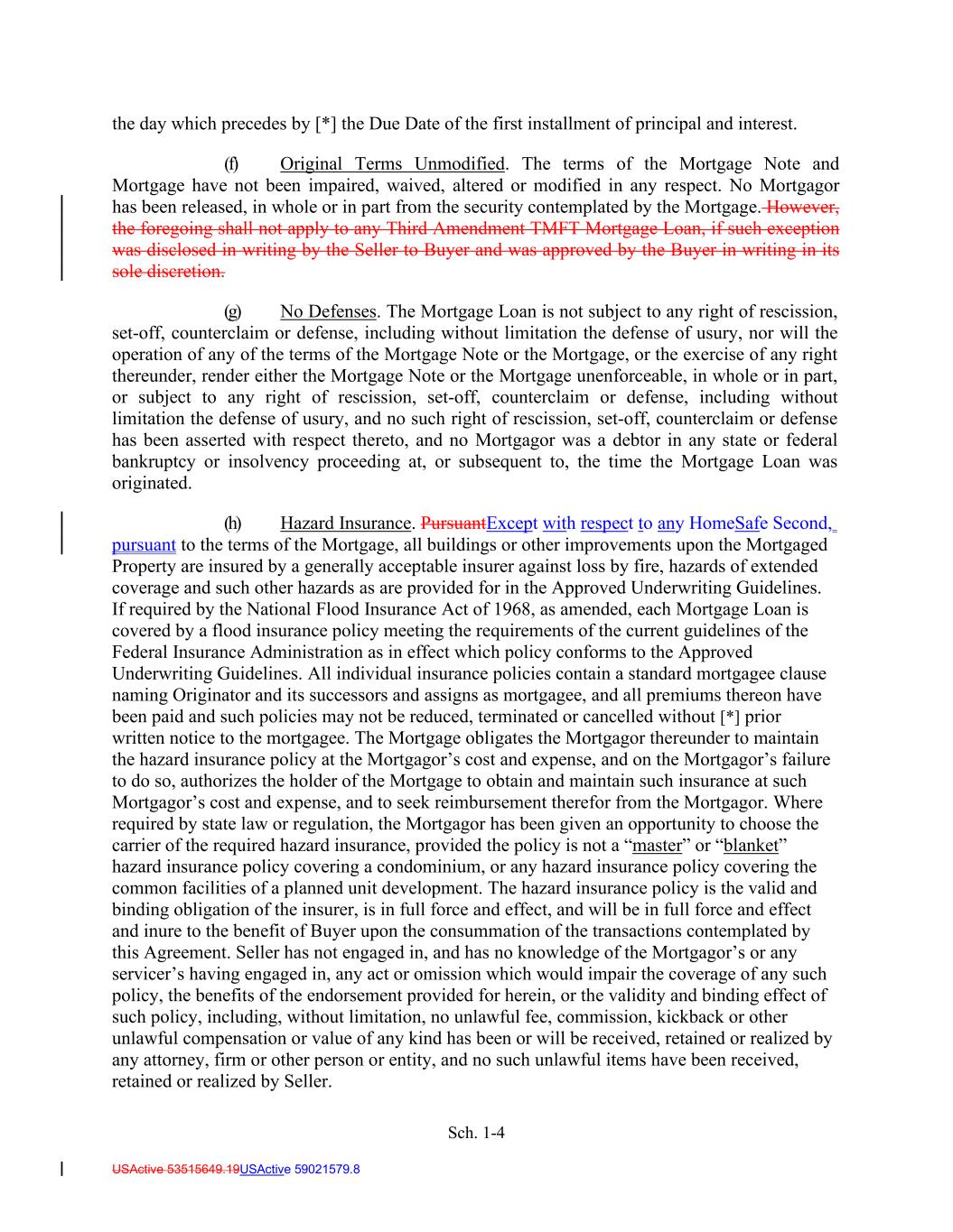 Sch. 1-4 USActive 53515649.19USActive 59021579.8 the day which precedes by [*] the Due Date of the first installment of principal and interest. (f) Original Terms Unmodified. The terms of the Mortgage Note and Mortgage have not been impaired, waived, altered or modified in any respect. No Mortgagor has been released, in whole or in part from the security contemplated by the Mortgage. However, the foregoing shall not apply to any Third Amendment TMFT Mortgage Loan, if such exception was disclosed in writing by the Seller to Buyer and was approved by the Buyer in writing in its sole discretion. (g) No Defenses. The Mortgage Loan is not subject to any right of rescission, set-off, counterclaim or defense, including without limitation the defense of usury, nor will the operation of any of the terms of the Mortgage Note or the Mortgage, or the exercise of any right thereunder, render either the Mortgage Note or the Mortgage unenforceable, in whole or in part, or subject to any right of rescission, set-off, counterclaim or defense, including without limitation the defense of usury, and no such right of rescission, set-off, counterclaim or defense has been asserted with respect thereto, and no Mortgagor was a debtor in any state or federal bankruptcy or insolvency proceeding at, or subsequent to, the time the Mortgage Loan was originated. (h) Hazard Insurance. PursuantExcept with respect to any HomeSafe Second, pursuant to the terms of the Mortgage, all buildings or other improvements upon the Mortgaged Property are insured by a generally acceptable insurer against loss by fire, hazards of extended coverage and such other hazards as are provided for in the Approved Underwriting Guidelines. If required by the National Flood Insurance Act of 1968, as amended, each Mortgage Loan is covered by a flood insurance policy meeting the requirements of the current guidelines of the Federal Insurance Administration as in effect which policy conforms to the Approved Underwriting Guidelines. All individual insurance policies contain a standard mortgagee clause naming Originator and its successors and assigns as mortgagee, and all premiums thereon have been paid and such policies may not be reduced, terminated or cancelled without [*] prior written notice to the mortgagee. The Mortgage obligates the Mortgagor thereunder to maintain the hazard insurance policy at the Mortgagor’s cost and expense, and on the Mortgagor’s failure to do so, authorizes the holder of the Mortgage to obtain and maintain such insurance at such Mortgagor’s cost and expense, and to seek reimbursement therefor from the Mortgagor. Where required by state law or regulation, the Mortgagor has been given an opportunity to choose the carrier of the required hazard insurance, provided the policy is not a “master” or “blanket” hazard insurance policy covering a condominium, or any hazard insurance policy covering the common facilities of a planned unit development. The hazard insurance policy is the valid and binding obligation of the insurer, is in full force and effect, and will be in full force and effect and inure to the benefit of Buyer upon the consummation of the transactions contemplated by this Agreement. Seller has not engaged in, and has no knowledge of the Mortgagor’s or any servicer’s having engaged in, any act or omission which would impair the coverage of any such policy, the benefits of the endorsement provided for herein, or the validity and binding effect of such policy, including, without limitation, no unlawful fee, commission, kickback or other unlawful compensation or value of any kind has been or will be received, retained or realized by any attorney, firm or other person or entity, and no such unlawful items have been received, retained or realized by Seller.