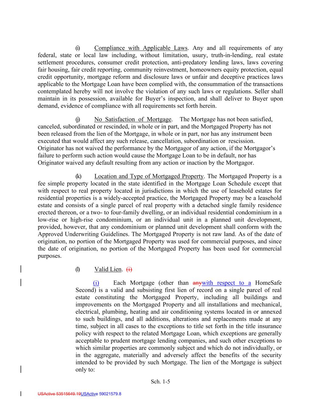 Sch. 1-5 USActive 53515649.19USActive 59021579.8 (i) Compliance with Applicable Laws. Any and all requirements of any federal, state or local law including, without limitation, usury, truth-in-lending, real estate settlement procedures, consumer credit protection, anti-predatory lending laws, laws covering fair housing, fair credit reporting, community reinvestment, homeowners equity protection, equal credit opportunity, mortgage reform and disclosure laws or unfair and deceptive practices laws applicable to the Mortgage Loan have been complied with, the consummation of the transactions contemplated hereby will not involve the violation of any such laws or regulations. Seller shall maintain in its possession, available for Buyer’s inspection, and shall deliver to Buyer upon demand, evidence of compliance with all requirements set forth herein. (j) No Satisfaction of Mortgage. The Mortgage has not been satisfied, canceled, subordinated or rescinded, in whole or in part, and the Mortgaged Property has not been released from the lien of the Mortgage, in whole or in part, nor has any instrument been executed that would affect any such release, cancellation, subordination or rescission. Originator has not waived the performance by the Mortgagor of any action, if the Mortgagor’s failure to perform such action would cause the Mortgage Loan to be in default, nor has Originator waived any default resulting from any action or inaction by the Mortgagor. (k) Location and Type of Mortgaged Property. The Mortgaged Property is a fee simple property located in the state identified in the Mortgage Loan Schedule except that with respect to real property located in jurisdictions in which the use of leasehold estates for residential properties is a widely-accepted practice, the Mortgaged Property may be a leasehold estate and consists of a single parcel of real property with a detached single family residence erected thereon, or a two- to four-family dwelling, or an individual residential condominium in a low-rise or high-rise condominium, or an individual unit in a planned unit development, provided, however, that any condominium or planned unit development shall conform with the Approved Underwriting Guidelines. The Mortgaged Property is not raw land. As of the date of origination, no portion of the Mortgaged Property was used for commercial purposes, and since the date of origination, no portion of the Mortgaged Property has been used for commercial purposes. (l) Valid Lien. (i) (i) Each Mortgage (other than anywith respect to a HomeSafe Second) is a valid and subsisting first lien of record on a single parcel of real estate constituting the Mortgaged Property, including all buildings and improvements on the Mortgaged Property and all installations and mechanical, electrical, plumbing, heating and air conditioning systems located in or annexed to such buildings, and all additions, alterations and replacements made at any time, subject in all cases to the exceptions to title set forth in the title insurance policy with respect to the related Mortgage Loan, which exceptions are generally acceptable to prudent mortgage lending companies, and such other exceptions to which similar properties are commonly subject and which do not individually, or in the aggregate, materially and adversely affect the benefits of the security intended to be provided by such Mortgage. The lien of the Mortgage is subject only to: