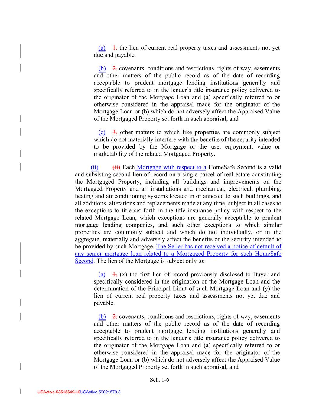 Sch. 1-6 USActive 53515649.19USActive 59021579.8 (a) 1. the lien of current real property taxes and assessments not yet due and payable. (b) 2. covenants, conditions and restrictions, rights of way, easements and other matters of the public record as of the date of recording acceptable to prudent mortgage lending institutions generally and specifically referred to in the lender’s title insurance policy delivered to the originator of the Mortgage Loan and (a) specifically referred to or otherwise considered in the appraisal made for the originator of the Mortgage Loan or (b) which do not adversely affect the Appraised Value of the Mortgaged Property set forth in such appraisal; and (c) 3. other matters to which like properties are commonly subject which do not materially interfere with the benefits of the security intended to be provided by the Mortgage or the use, enjoyment, value or marketability of the related Mortgaged Property. (ii) (ii) Each Mortgage with respect to a HomeSafe Second is a valid and subsisting second lien of record on a single parcel of real estate constituting the Mortgaged Property, including all buildings and improvements on the Mortgaged Property and all installations and mechanical, electrical, plumbing, heating and air conditioning systems located in or annexed to such buildings, and all additions, alterations and replacements made at any time, subject in all cases to the exceptions to title set forth in the title insurance policy with respect to the related Mortgage Loan, which exceptions are generally acceptable to prudent mortgage lending companies, and such other exceptions to which similar properties are commonly subject and which do not individually, or in the aggregate, materially and adversely affect the benefits of the security intended to be provided by such Mortgage. The Seller has not received a notice of default of any senior mortgage loan related to a Mortgaged Property for such HomeSafe Second. The lien of the Mortgage is subject only to: (a) 1. (x) the first lien of record previously disclosed to Buyer and specifically considered in the origination of the Mortgage Loan and the determination of the Principal Limit of such Mortgage Loan and (y) the lien of current real property taxes and assessments not yet due and payable. (b) 2. covenants, conditions and restrictions, rights of way, easements and other matters of the public record as of the date of recording acceptable to prudent mortgage lending institutions generally and specifically referred to in the lender’s title insurance policy delivered to the originator of the Mortgage Loan and (a) specifically referred to or otherwise considered in the appraisal made for the originator of the Mortgage Loan or (b) which do not adversely affect the Appraised Value of the Mortgaged Property set forth in such appraisal; and