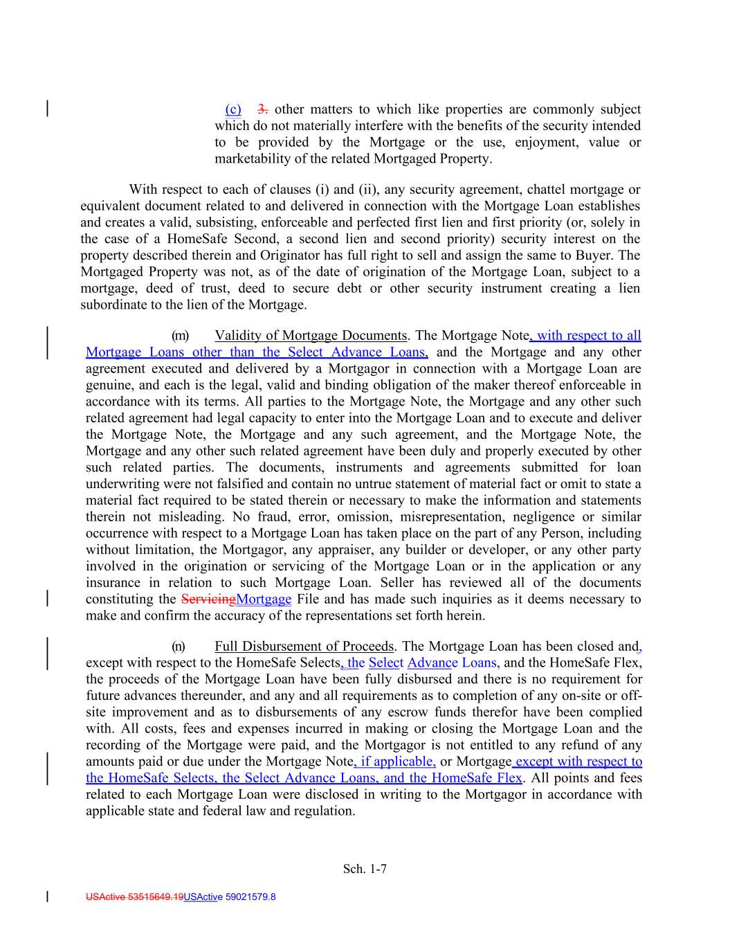Sch. 1-7 USActive 53515649.19USActive 59021579.8 (c) 3. other matters to which like properties are commonly subject which do not materially interfere with the benefits of the security intended to be provided by the Mortgage or the use, enjoyment, value or marketability of the related Mortgaged Property. With respect to each of clauses (i) and (ii), any security agreement, chattel mortgage or equivalent document related to and delivered in connection with the Mortgage Loan establishes and creates a valid, subsisting, enforceable and perfected first lien and first priority (or, solely in the case of a HomeSafe Second, a second lien and second priority) security interest on the property described therein and Originator has full right to sell and assign the same to Buyer. The Mortgaged Property was not, as of the date of origination of the Mortgage Loan, subject to a mortgage, deed of trust, deed to secure debt or other security instrument creating a lien subordinate to the lien of the Mortgage. (m) Validity of Mortgage Documents. The Mortgage Note, with respect to all Mortgage Loans other than the Select Advance Loans, and the Mortgage and any other agreement executed and delivered by a Mortgagor in connection with a Mortgage Loan are genuine, and each is the legal, valid and binding obligation of the maker thereof enforceable in accordance with its terms. All parties to the Mortgage Note, the Mortgage and any other such related agreement had legal capacity to enter into the Mortgage Loan and to execute and deliver the Mortgage Note, the Mortgage and any such agreement, and the Mortgage Note, the Mortgage and any other such related agreement have been duly and properly executed by other such related parties. The documents, instruments and agreements submitted for loan underwriting were not falsified and contain no untrue statement of material fact or omit to state a material fact required to be stated therein or necessary to make the information and statements therein not misleading. No fraud, error, omission, misrepresentation, negligence or similar occurrence with respect to a Mortgage Loan has taken place on the part of any Person, including without limitation, the Mortgagor, any appraiser, any builder or developer, or any other party involved in the origination or servicing of the Mortgage Loan or in the application or any insurance in relation to such Mortgage Loan. Seller has reviewed all of the documents constituting the ServicingMortgage File and has made such inquiries as it deems necessary to make and confirm the accuracy of the representations set forth herein. (n) Full Disbursement of Proceeds. The Mortgage Loan has been closed and, except with respect to the HomeSafe Selects, the Select Advance Loans, and the HomeSafe Flex, the proceeds of the Mortgage Loan have been fully disbursed and there is no requirement for future advances thereunder, and any and all requirements as to completion of any on-site or off- site improvement and as to disbursements of any escrow funds therefor have been complied with. All costs, fees and expenses incurred in making or closing the Mortgage Loan and the recording of the Mortgage were paid, and the Mortgagor is not entitled to any refund of any amounts paid or due under the Mortgage Note, if applicable, or Mortgage except with respect to the HomeSafe Selects, the Select Advance Loans, and the HomeSafe Flex. All points and fees related to each Mortgage Loan were disclosed in writing to the Mortgagor in accordance with applicable state and federal law and regulation.