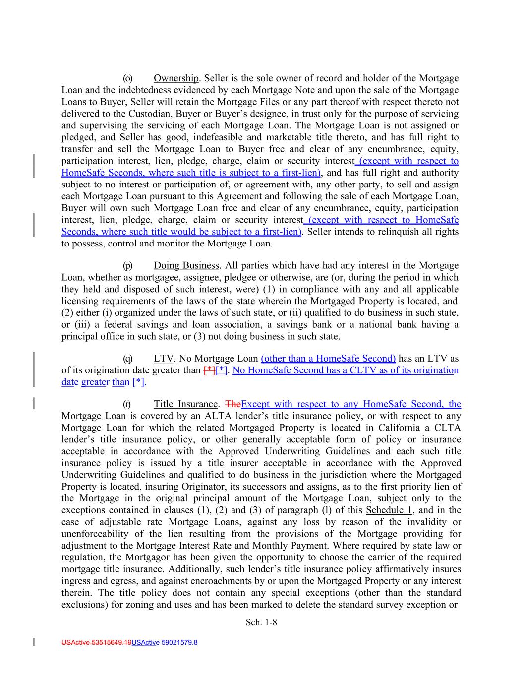 Sch. 1-8 USActive 53515649.19USActive 59021579.8 (o) Ownership. Seller is the sole owner of record and holder of the Mortgage Loan and the indebtedness evidenced by each Mortgage Note and upon the sale of the Mortgage Loans to Buyer, Seller will retain the Mortgage Files or any part thereof with respect thereto not delivered to the Custodian, Buyer or Buyer’s designee, in trust only for the purpose of servicing and supervising the servicing of each Mortgage Loan. The Mortgage Loan is not assigned or pledged, and Seller has good, indefeasible and marketable title thereto, and has full right to transfer and sell the Mortgage Loan to Buyer free and clear of any encumbrance, equity, participation interest, lien, pledge, charge, claim or security interest (except with respect to HomeSafe Seconds, where such title is subject to a first-lien), and has full right and authority subject to no interest or participation of, or agreement with, any other party, to sell and assign each Mortgage Loan pursuant to this Agreement and following the sale of each Mortgage Loan, Buyer will own such Mortgage Loan free and clear of any encumbrance, equity, participation interest, lien, pledge, charge, claim or security interest (except with respect to HomeSafe Seconds, where such title would be subject to a first-lien). Seller intends to relinquish all rights to possess, control and monitor the Mortgage Loan. (p) Doing Business. All parties which have had any interest in the Mortgage Loan, whether as mortgagee, assignee, pledgee or otherwise, are (or, during the period in which they held and disposed of such interest, were) (1) in compliance with any and all applicable licensing requirements of the laws of the state wherein the Mortgaged Property is located, and (2) either (i) organized under the laws of such state, or (ii) qualified to do business in such state, or (iii) a federal savings and loan association, a savings bank or a national bank having a principal office in such state, or (3) not doing business in such state. (q) LTV. No Mortgage Loan (other than a HomeSafe Second) has an LTV as of its origination date greater than [*][*]. No HomeSafe Second has a CLTV as of its origination date greater than [*]. (r) Title Insurance. TheExcept with respect to any HomeSafe Second, the Mortgage Loan is covered by an ALTA lender’s title insurance policy, or with respect to any Mortgage Loan for which the related Mortgaged Property is located in California a CLTA lender’s title insurance policy, or other generally acceptable form of policy or insurance acceptable in accordance with the Approved Underwriting Guidelines and each such title insurance policy is issued by a title insurer acceptable in accordance with the Approved Underwriting Guidelines and qualified to do business in the jurisdiction where the Mortgaged Property is located, insuring Originator, its successors and assigns, as to the first priority lien of the Mortgage in the original principal amount of the Mortgage Loan, subject only to the exceptions contained in clauses (1), (2) and (3) of paragraph (l) of this Schedule 1, and in the case of adjustable rate Mortgage Loans, against any loss by reason of the invalidity or unenforceability of the lien resulting from the provisions of the Mortgage providing for adjustment to the Mortgage Interest Rate and Monthly Payment. Where required by state law or regulation, the Mortgagor has been given the opportunity to choose the carrier of the required mortgage title insurance. Additionally, such lender’s title insurance policy affirmatively insures ingress and egress, and against encroachments by or upon the Mortgaged Property or any interest therein. The title policy does not contain any special exceptions (other than the standard exclusions) for zoning and uses and has been marked to delete the standard survey exception or