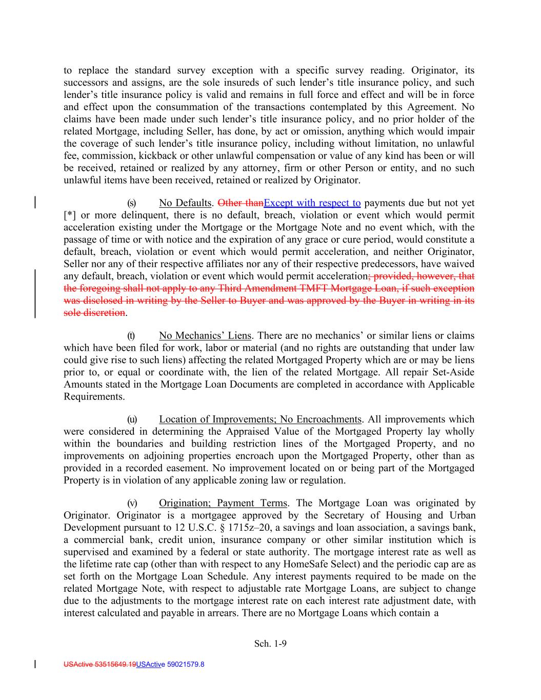 Sch. 1-9 USActive 53515649.19USActive 59021579.8 to replace the standard survey exception with a specific survey reading. Originator, its successors and assigns, are the sole insureds of such lender’s title insurance policy, and such lender’s title insurance policy is valid and remains in full force and effect and will be in force and effect upon the consummation of the transactions contemplated by this Agreement. No claims have been made under such lender’s title insurance policy, and no prior holder of the related Mortgage, including Seller, has done, by act or omission, anything which would impair the coverage of such lender’s title insurance policy, including without limitation, no unlawful fee, commission, kickback or other unlawful compensation or value of any kind has been or will be received, retained or realized by any attorney, firm or other Person or entity, and no such unlawful items have been received, retained or realized by Originator. (s) No Defaults. Other thanExcept with respect to payments due but not yet [*] or more delinquent, there is no default, breach, violation or event which would permit acceleration existing under the Mortgage or the Mortgage Note and no event which, with the passage of time or with notice and the expiration of any grace or cure period, would constitute a default, breach, violation or event which would permit acceleration, and neither Originator, Seller nor any of their respective affiliates nor any of their respective predecessors, have waived any default, breach, violation or event which would permit acceleration; provided, however, that the foregoing shall not apply to any Third Amendment TMFT Mortgage Loan, if such exception was disclosed in writing by the Seller to Buyer and was approved by the Buyer in writing in its sole discretion. (t) No Mechanics’ Liens. There are no mechanics’ or similar liens or claims which have been filed for work, labor or material (and no rights are outstanding that under law could give rise to such liens) affecting the related Mortgaged Property which are or may be liens prior to, or equal or coordinate with, the lien of the related Mortgage. All repair Set-Aside Amounts stated in the Mortgage Loan Documents are completed in accordance with Applicable Requirements. (u) Location of Improvements; No Encroachments. All improvements which were considered in determining the Appraised Value of the Mortgaged Property lay wholly within the boundaries and building restriction lines of the Mortgaged Property, and no improvements on adjoining properties encroach upon the Mortgaged Property, other than as provided in a recorded easement. No improvement located on or being part of the Mortgaged Property is in violation of any applicable zoning law or regulation. (v) Origination; Payment Terms. The Mortgage Loan was originated by Originator. Originator is a mortgagee approved by the Secretary of Housing and Urban Development pursuant to 12 U.S.C. § 1715z–20, a savings and loan association, a savings bank, a commercial bank, credit union, insurance company or other similar institution which is supervised and examined by a federal or state authority. The mortgage interest rate as well as the lifetime rate cap (other than with respect to any HomeSafe Select) and the periodic cap are as set forth on the Mortgage Loan Schedule. Any interest payments required to be made on the related Mortgage Note, with respect to adjustable rate Mortgage Loans, are subject to change due to the adjustments to the mortgage interest rate on each interest rate adjustment date, with interest calculated and payable in arrears. There are no Mortgage Loans which contain a