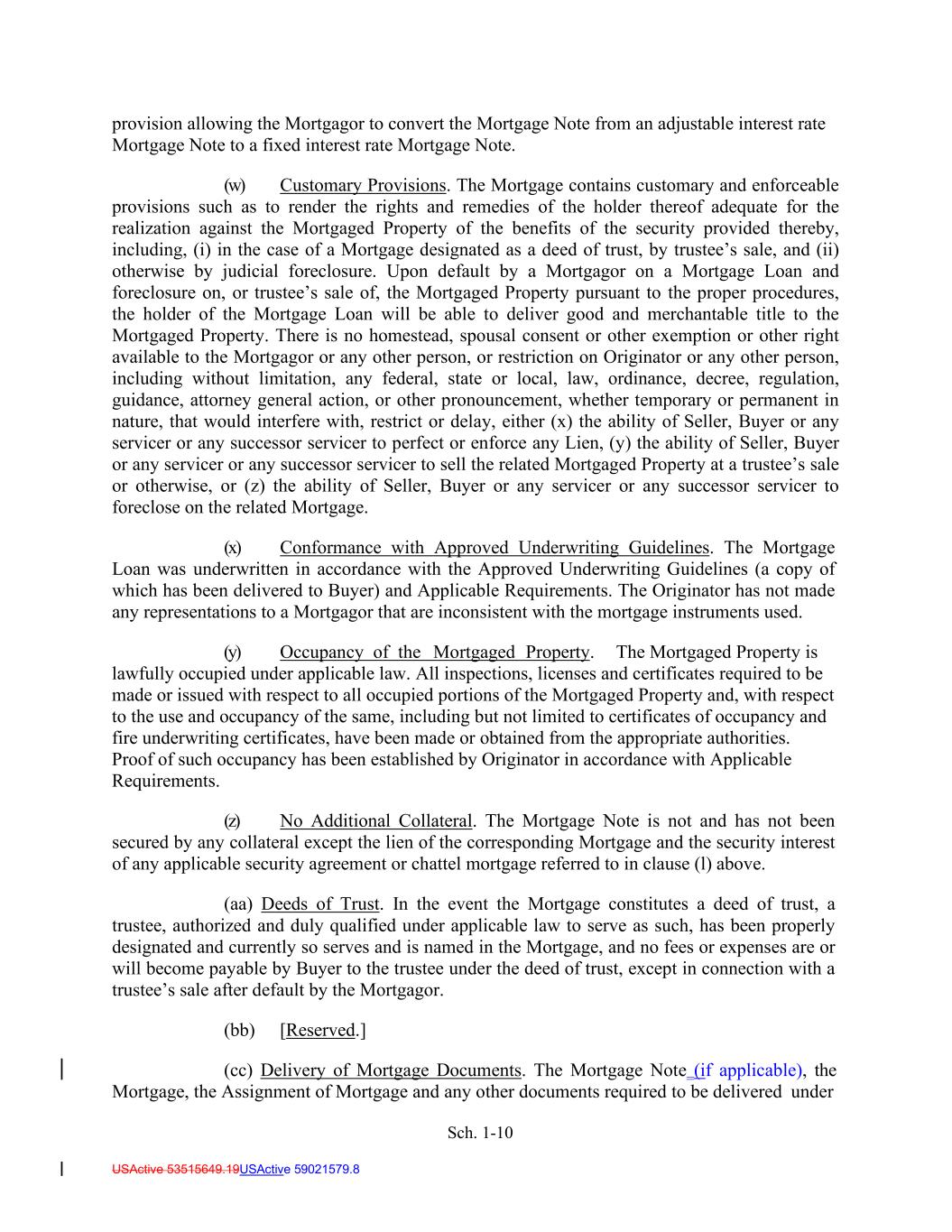 Sch. 1-10 USActive 53515649.19USActive 59021579.8 provision allowing the Mortgagor to convert the Mortgage Note from an adjustable interest rate Mortgage Note to a fixed interest rate Mortgage Note. (w) Customary Provisions. The Mortgage contains customary and enforceable provisions such as to render the rights and remedies of the holder thereof adequate for the realization against the Mortgaged Property of the benefits of the security provided thereby, including, (i) in the case of a Mortgage designated as a deed of trust, by trustee’s sale, and (ii) otherwise by judicial foreclosure. Upon default by a Mortgagor on a Mortgage Loan and foreclosure on, or trustee’s sale of, the Mortgaged Property pursuant to the proper procedures, the holder of the Mortgage Loan will be able to deliver good and merchantable title to the Mortgaged Property. There is no homestead, spousal consent or other exemption or other right available to the Mortgagor or any other person, or restriction on Originator or any other person, including without limitation, any federal, state or local, law, ordinance, decree, regulation, guidance, attorney general action, or other pronouncement, whether temporary or permanent in nature, that would interfere with, restrict or delay, either (x) the ability of Seller, Buyer or any servicer or any successor servicer to perfect or enforce any Lien, (y) the ability of Seller, Buyer or any servicer or any successor servicer to sell the related Mortgaged Property at a trustee’s sale or otherwise, or (z) the ability of Seller, Buyer or any servicer or any successor servicer to foreclose on the related Mortgage. (x) Conformance with Approved Underwriting Guidelines. The Mortgage Loan was underwritten in accordance with the Approved Underwriting Guidelines (a copy of which has been delivered to Buyer) and Applicable Requirements. The Originator has not made any representations to a Mortgagor that are inconsistent with the mortgage instruments used. (y) Occupancy of the Mortgaged Property. The Mortgaged Property is lawfully occupied under applicable law. All inspections, licenses and certificates required to be made or issued with respect to all occupied portions of the Mortgaged Property and, with respect to the use and occupancy of the same, including but not limited to certificates of occupancy and fire underwriting certificates, have been made or obtained from the appropriate authorities. Proof of such occupancy has been established by Originator in accordance with Applicable Requirements. (z) No Additional Collateral. The Mortgage Note is not and has not been secured by any collateral except the lien of the corresponding Mortgage and the security interest of any applicable security agreement or chattel mortgage referred to in clause (l) above. (aa) Deeds of Trust. In the event the Mortgage constitutes a deed of trust, a trustee, authorized and duly qualified under applicable law to serve as such, has been properly designated and currently so serves and is named in the Mortgage, and no fees or expenses are or will become payable by Buyer to the trustee under the deed of trust, except in connection with a trustee’s sale after default by the Mortgagor. (bb) [Reserved.] (cc) Delivery of Mortgage Documents. The Mortgage Note (if applicable), the Mortgage, the Assignment of Mortgage and any other documents required to be delivered under