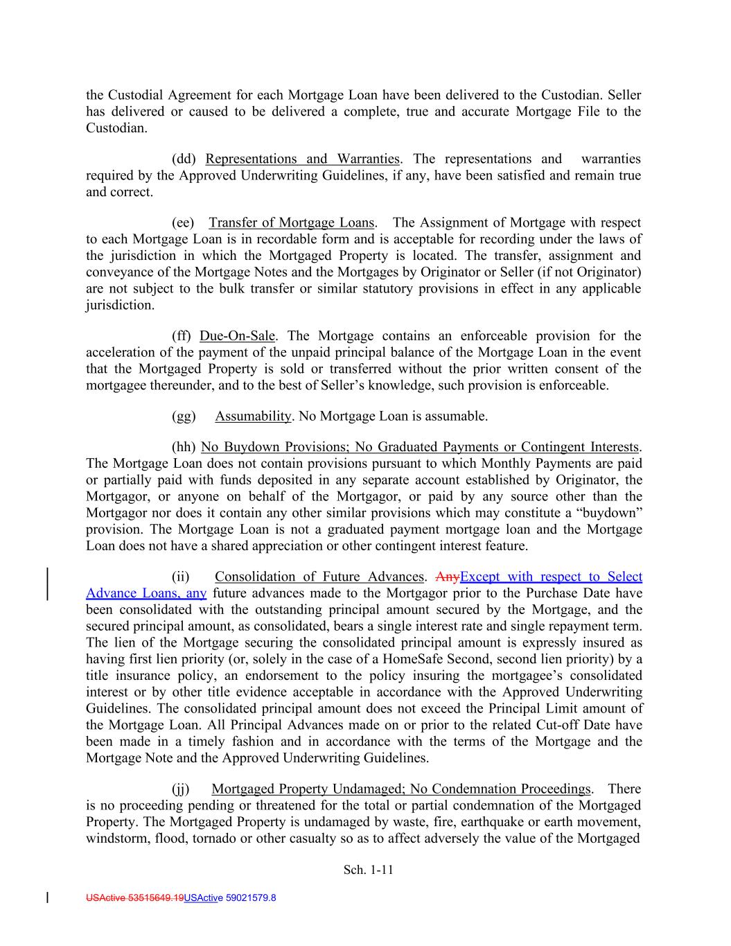 Sch. 1-11 USActive 53515649.19USActive 59021579.8 the Custodial Agreement for each Mortgage Loan have been delivered to the Custodian. Seller has delivered or caused to be delivered a complete, true and accurate Mortgage File to the Custodian. (dd) Representations and Warranties. The representations and warranties required by the Approved Underwriting Guidelines, if any, have been satisfied and remain true and correct. (ee) Transfer of Mortgage Loans. The Assignment of Mortgage with respect to each Mortgage Loan is in recordable form and is acceptable for recording under the laws of the jurisdiction in which the Mortgaged Property is located. The transfer, assignment and conveyance of the Mortgage Notes and the Mortgages by Originator or Seller (if not Originator) are not subject to the bulk transfer or similar statutory provisions in effect in any applicable jurisdiction. (ff) Due-On-Sale. The Mortgage contains an enforceable provision for the acceleration of the payment of the unpaid principal balance of the Mortgage Loan in the event that the Mortgaged Property is sold or transferred without the prior written consent of the mortgagee thereunder, and to the best of Seller’s knowledge, such provision is enforceable. (gg) Assumability. No Mortgage Loan is assumable. (hh) No Buydown Provisions; No Graduated Payments or Contingent Interests. The Mortgage Loan does not contain provisions pursuant to which Monthly Payments are paid or partially paid with funds deposited in any separate account established by Originator, the Mortgagor, or anyone on behalf of the Mortgagor, or paid by any source other than the Mortgagor nor does it contain any other similar provisions which may constitute a “buydown” provision. The Mortgage Loan is not a graduated payment mortgage loan and the Mortgage Loan does not have a shared appreciation or other contingent interest feature. (ii) Consolidation of Future Advances. AnyExcept with respect to Select Advance Loans, any future advances made to the Mortgagor prior to the Purchase Date have been consolidated with the outstanding principal amount secured by the Mortgage, and the secured principal amount, as consolidated, bears a single interest rate and single repayment term. The lien of the Mortgage securing the consolidated principal amount is expressly insured as having first lien priority (or, solely in the case of a HomeSafe Second, second lien priority) by a title insurance policy, an endorsement to the policy insuring the mortgagee’s consolidated interest or by other title evidence acceptable in accordance with the Approved Underwriting Guidelines. The consolidated principal amount does not exceed the Principal Limit amount of the Mortgage Loan. All Principal Advances made on or prior to the related Cut-off Date have been made in a timely fashion and in accordance with the terms of the Mortgage and the Mortgage Note and the Approved Underwriting Guidelines. (jj) Mortgaged Property Undamaged; No Condemnation Proceedings. There is no proceeding pending or threatened for the total or partial condemnation of the Mortgaged Property. The Mortgaged Property is undamaged by waste, fire, earthquake or earth movement, windstorm, flood, tornado or other casualty so as to affect adversely the value of the Mortgaged