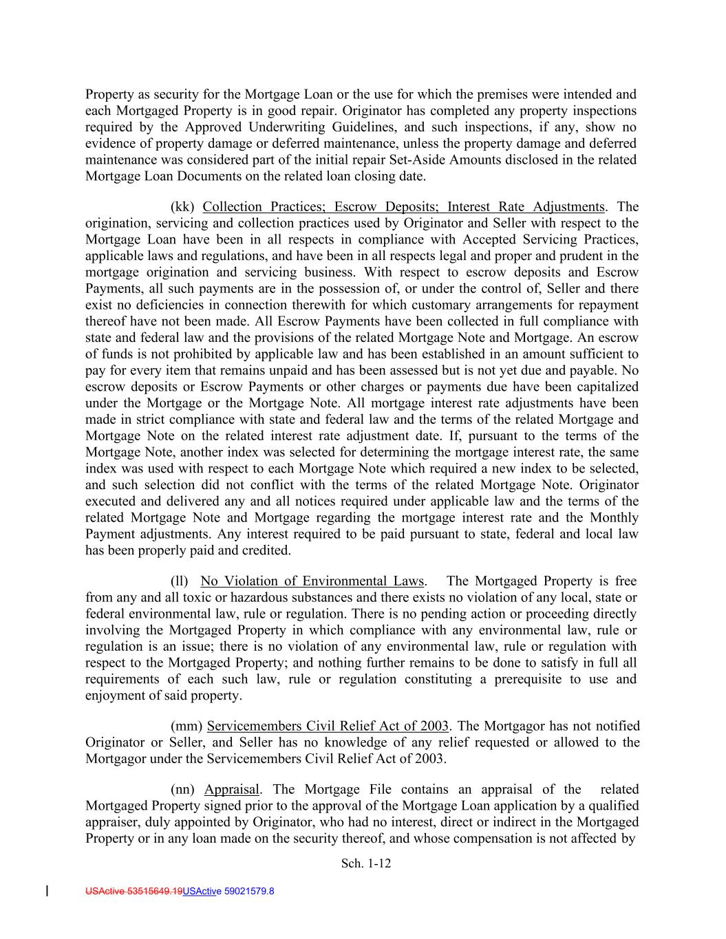 Sch. 1-12 USActive 53515649.19USActive 59021579.8 Property as security for the Mortgage Loan or the use for which the premises were intended and each Mortgaged Property is in good repair. Originator has completed any property inspections required by the Approved Underwriting Guidelines, and such inspections, if any, show no evidence of property damage or deferred maintenance, unless the property damage and deferred maintenance was considered part of the initial repair Set-Aside Amounts disclosed in the related Mortgage Loan Documents on the related loan closing date. (kk) Collection Practices; Escrow Deposits; Interest Rate Adjustments. The origination, servicing and collection practices used by Originator and Seller with respect to the Mortgage Loan have been in all respects in compliance with Accepted Servicing Practices, applicable laws and regulations, and have been in all respects legal and proper and prudent in the mortgage origination and servicing business. With respect to escrow deposits and Escrow Payments, all such payments are in the possession of, or under the control of, Seller and there exist no deficiencies in connection therewith for which customary arrangements for repayment thereof have not been made. All Escrow Payments have been collected in full compliance with state and federal law and the provisions of the related Mortgage Note and Mortgage. An escrow of funds is not prohibited by applicable law and has been established in an amount sufficient to pay for every item that remains unpaid and has been assessed but is not yet due and payable. No escrow deposits or Escrow Payments or other charges or payments due have been capitalized under the Mortgage or the Mortgage Note. All mortgage interest rate adjustments have been made in strict compliance with state and federal law and the terms of the related Mortgage and Mortgage Note on the related interest rate adjustment date. If, pursuant to the terms of the Mortgage Note, another index was selected for determining the mortgage interest rate, the same index was used with respect to each Mortgage Note which required a new index to be selected, and such selection did not conflict with the terms of the related Mortgage Note. Originator executed and delivered any and all notices required under applicable law and the terms of the related Mortgage Note and Mortgage regarding the mortgage interest rate and the Monthly Payment adjustments. Any interest required to be paid pursuant to state, federal and local law has been properly paid and credited. (ll) No Violation of Environmental Laws. The Mortgaged Property is free from any and all toxic or hazardous substances and there exists no violation of any local, state or federal environmental law, rule or regulation. There is no pending action or proceeding directly involving the Mortgaged Property in which compliance with any environmental law, rule or regulation is an issue; there is no violation of any environmental law, rule or regulation with respect to the Mortgaged Property; and nothing further remains to be done to satisfy in full all requirements of each such law, rule or regulation constituting a prerequisite to use and enjoyment of said property. (mm) Servicemembers Civil Relief Act of 2003. The Mortgagor has not notified Originator or Seller, and Seller has no knowledge of any relief requested or allowed to the Mortgagor under the Servicemembers Civil Relief Act of 2003. (nn) Appraisal. The Mortgage File contains an appraisal of the related Mortgaged Property signed prior to the approval of the Mortgage Loan application by a qualified appraiser, duly appointed by Originator, who had no interest, direct or indirect in the Mortgaged Property or in any loan made on the security thereof, and whose compensation is not affected by