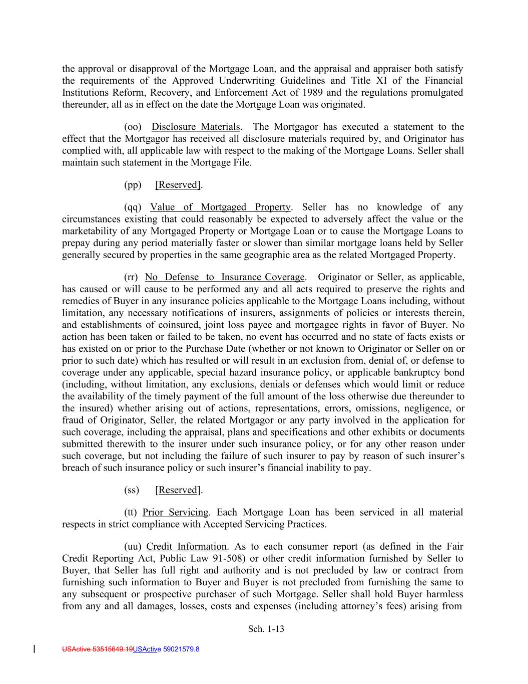 Sch. 1-13 USActive 53515649.19USActive 59021579.8 the approval or disapproval of the Mortgage Loan, and the appraisal and appraiser both satisfy the requirements of the Approved Underwriting Guidelines and Title XI of the Financial Institutions Reform, Recovery, and Enforcement Act of 1989 and the regulations promulgated thereunder, all as in effect on the date the Mortgage Loan was originated. (oo) Disclosure Materials. The Mortgagor has executed a statement to the effect that the Mortgagor has received all disclosure materials required by, and Originator has complied with, all applicable law with respect to the making of the Mortgage Loans. Seller shall maintain such statement in the Mortgage File. (pp) [Reserved]. (qq) Value of Mortgaged Property. Seller has no knowledge of any circumstances existing that could reasonably be expected to adversely affect the value or the marketability of any Mortgaged Property or Mortgage Loan or to cause the Mortgage Loans to prepay during any period materially faster or slower than similar mortgage loans held by Seller generally secured by properties in the same geographic area as the related Mortgaged Property. (rr) No Defense to Insurance Coverage. Originator or Seller, as applicable, has caused or will cause to be performed any and all acts required to preserve the rights and remedies of Buyer in any insurance policies applicable to the Mortgage Loans including, without limitation, any necessary notifications of insurers, assignments of policies or interests therein, and establishments of coinsured, joint loss payee and mortgagee rights in favor of Buyer. No action has been taken or failed to be taken, no event has occurred and no state of facts exists or has existed on or prior to the Purchase Date (whether or not known to Originator or Seller on or prior to such date) which has resulted or will result in an exclusion from, denial of, or defense to coverage under any applicable, special hazard insurance policy, or applicable bankruptcy bond (including, without limitation, any exclusions, denials or defenses which would limit or reduce the availability of the timely payment of the full amount of the loss otherwise due thereunder to the insured) whether arising out of actions, representations, errors, omissions, negligence, or fraud of Originator, Seller, the related Mortgagor or any party involved in the application for such coverage, including the appraisal, plans and specifications and other exhibits or documents submitted therewith to the insurer under such insurance policy, or for any other reason under such coverage, but not including the failure of such insurer to pay by reason of such insurer’s breach of such insurance policy or such insurer’s financial inability to pay. (ss) [Reserved]. (tt) Prior Servicing. Each Mortgage Loan has been serviced in all material respects in strict compliance with Accepted Servicing Practices. (uu) Credit Information. As to each consumer report (as defined in the Fair Credit Reporting Act, Public Law 91-508) or other credit information furnished by Seller to Buyer, that Seller has full right and authority and is not precluded by law or contract from furnishing such information to Buyer and Buyer is not precluded from furnishing the same to any subsequent or prospective purchaser of such Mortgage. Seller shall hold Buyer harmless from any and all damages, losses, costs and expenses (including attorney’s fees) arising from
