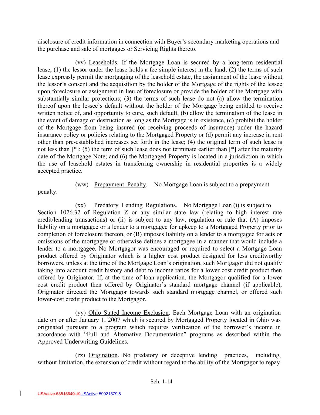 Sch. 1-14 USActive 53515649.19USActive 59021579.8 disclosure of credit information in connection with Buyer’s secondary marketing operations and the purchase and sale of mortgages or Servicing Rights thereto. (vv) Leaseholds. If the Mortgage Loan is secured by a long-term residential lease, (1) the lessor under the lease holds a fee simple interest in the land; (2) the terms of such lease expressly permit the mortgaging of the leasehold estate, the assignment of the lease without the lessor’s consent and the acquisition by the holder of the Mortgage of the rights of the lessee upon foreclosure or assignment in lieu of foreclosure or provide the holder of the Mortgage with substantially similar protections; (3) the terms of such lease do not (a) allow the termination thereof upon the lessee’s default without the holder of the Mortgage being entitled to receive written notice of, and opportunity to cure, such default, (b) allow the termination of the lease in the event of damage or destruction as long as the Mortgage is in existence, (c) prohibit the holder of the Mortgage from being insured (or receiving proceeds of insurance) under the hazard insurance policy or policies relating to the Mortgaged Property or (d) permit any increase in rent other than pre-established increases set forth in the lease; (4) the original term of such lease is not less than [*]; (5) the term of such lease does not terminate earlier than [*] after the maturity date of the Mortgage Note; and (6) the Mortgaged Property is located in a jurisdiction in which the use of leasehold estates in transferring ownership in residential properties is a widely accepted practice. (ww) Prepayment Penalty. No Mortgage Loan is subject to a prepayment penalty. (xx) Predatory Lending Regulations. No Mortgage Loan (i) is subject to Section 1026.32 of Regulation Z or any similar state law (relating to high interest rate credit/lending transactions) or (ii) is subject to any law, regulation or rule that (A) imposes liability on a mortgagee or a lender to a mortgagee for upkeep to a Mortgaged Property prior to completion of foreclosure thereon, or (B) imposes liability on a lender to a mortgagee for acts or omissions of the mortgagee or otherwise defines a mortgagee in a manner that would include a lender to a mortgagee. No Mortgagor was encouraged or required to select a Mortgage Loan product offered by Originator which is a higher cost product designed for less creditworthy borrowers, unless at the time of the Mortgage Loan’s origination, such Mortgagor did not qualify taking into account credit history and debt to income ratios for a lower cost credit product then offered by Originator. If, at the time of loan application, the Mortgagor qualified for a lower cost credit product then offered by Originator’s standard mortgage channel (if applicable), Originator directed the Mortgagor towards such standard mortgage channel, or offered such lower-cost credit product to the Mortgagor. (yy) Ohio Stated Income Exclusion. Each Mortgage Loan with an origination date on or after January 1, 2007 which is secured by Mortgaged Property located in Ohio was originated pursuant to a program which requires verification of the borrower’s income in accordance with “Full and Alternative Documentation” programs as described within the Approved Underwriting Guidelines. (zz) Origination. No predatory or deceptive lending practices, including, without limitation, the extension of credit without regard to the ability of the Mortgagor to repay