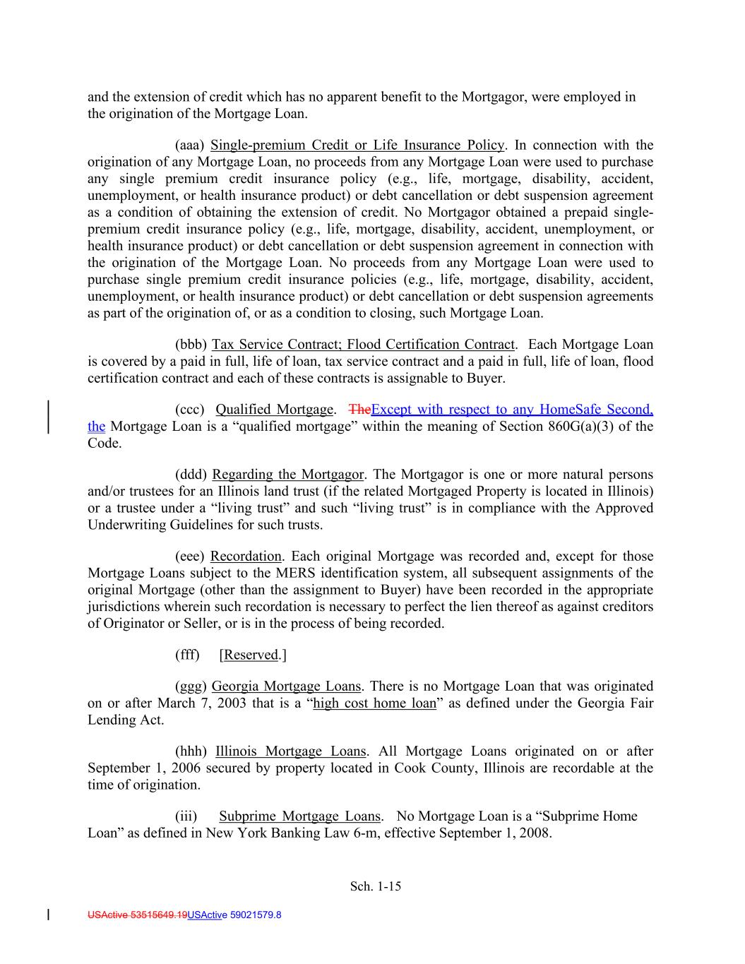 Sch. 1-15 USActive 53515649.19USActive 59021579.8 and the extension of credit which has no apparent benefit to the Mortgagor, were employed in the origination of the Mortgage Loan. (aaa) Single-premium Credit or Life Insurance Policy. In connection with the origination of any Mortgage Loan, no proceeds from any Mortgage Loan were used to purchase any single premium credit insurance policy (e.g., life, mortgage, disability, accident, unemployment, or health insurance product) or debt cancellation or debt suspension agreement as a condition of obtaining the extension of credit. No Mortgagor obtained a prepaid single- premium credit insurance policy (e.g., life, mortgage, disability, accident, unemployment, or health insurance product) or debt cancellation or debt suspension agreement in connection with the origination of the Mortgage Loan. No proceeds from any Mortgage Loan were used to purchase single premium credit insurance policies (e.g., life, mortgage, disability, accident, unemployment, or health insurance product) or debt cancellation or debt suspension agreements as part of the origination of, or as a condition to closing, such Mortgage Loan. (bbb) Tax Service Contract; Flood Certification Contract. Each Mortgage Loan is covered by a paid in full, life of loan, tax service contract and a paid in full, life of loan, flood certification contract and each of these contracts is assignable to Buyer. (ccc) Qualified Mortgage. TheExcept with respect to any HomeSafe Second, the Mortgage Loan is a “qualified mortgage” within the meaning of Section 860G(a)(3) of the Code. (ddd) Regarding the Mortgagor. The Mortgagor is one or more natural persons and/or trustees for an Illinois land trust (if the related Mortgaged Property is located in Illinois) or a trustee under a “living trust” and such “living trust” is in compliance with the Approved Underwriting Guidelines for such trusts. (eee) Recordation. Each original Mortgage was recorded and, except for those Mortgage Loans subject to the MERS identification system, all subsequent assignments of the original Mortgage (other than the assignment to Buyer) have been recorded in the appropriate jurisdictions wherein such recordation is necessary to perfect the lien thereof as against creditors of Originator or Seller, or is in the process of being recorded. (fff) [Reserved.] (ggg) Georgia Mortgage Loans. There is no Mortgage Loan that was originated on or after March 7, 2003 that is a “high cost home loan” as defined under the Georgia Fair Lending Act. (hhh) Illinois Mortgage Loans. All Mortgage Loans originated on or after September 1, 2006 secured by property located in Cook County, Illinois are recordable at the time of origination. (iii) Subprime Mortgage Loans. No Mortgage Loan is a “Subprime Home Loan” as defined in New York Banking Law 6-m, effective September 1, 2008.