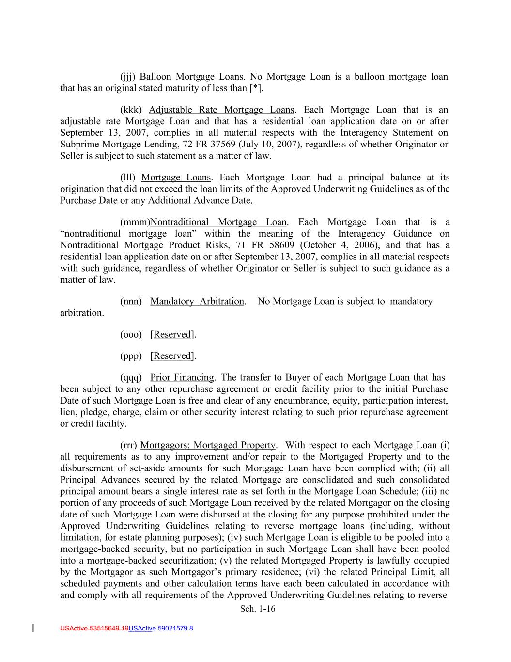 Sch. 1-16 USActive 53515649.19USActive 59021579.8 (jjj) Balloon Mortgage Loans. No Mortgage Loan is a balloon mortgage loan that has an original stated maturity of less than [*]. (kkk) Adjustable Rate Mortgage Loans. Each Mortgage Loan that is an adjustable rate Mortgage Loan and that has a residential loan application date on or after September 13, 2007, complies in all material respects with the Interagency Statement on Subprime Mortgage Lending, 72 FR 37569 (July 10, 2007), regardless of whether Originator or Seller is subject to such statement as a matter of law. (lll) Mortgage Loans. Each Mortgage Loan had a principal balance at its origination that did not exceed the loan limits of the Approved Underwriting Guidelines as of the Purchase Date or any Additional Advance Date. (mmm)Nontraditional Mortgage Loan. Each Mortgage Loan that is a “nontraditional mortgage loan” within the meaning of the Interagency Guidance on Nontraditional Mortgage Product Risks, 71 FR 58609 (October 4, 2006), and that has a residential loan application date on or after September 13, 2007, complies in all material respects with such guidance, regardless of whether Originator or Seller is subject to such guidance as a matter of law. arbitration. (nnn) Mandatory Arbitration. No Mortgage Loan is subject to mandatory (ooo) [Reserved]. (ppp) [Reserved]. (qqq) Prior Financing. The transfer to Buyer of each Mortgage Loan that has been subject to any other repurchase agreement or credit facility prior to the initial Purchase Date of such Mortgage Loan is free and clear of any encumbrance, equity, participation interest, lien, pledge, charge, claim or other security interest relating to such prior repurchase agreement or credit facility. (rrr) Mortgagors; Mortgaged Property. With respect to each Mortgage Loan (i) all requirements as to any improvement and/or repair to the Mortgaged Property and to the disbursement of set-aside amounts for such Mortgage Loan have been complied with; (ii) all Principal Advances secured by the related Mortgage are consolidated and such consolidated principal amount bears a single interest rate as set forth in the Mortgage Loan Schedule; (iii) no portion of any proceeds of such Mortgage Loan received by the related Mortgagor on the closing date of such Mortgage Loan were disbursed at the closing for any purpose prohibited under the Approved Underwriting Guidelines relating to reverse mortgage loans (including, without limitation, for estate planning purposes); (iv) such Mortgage Loan is eligible to be pooled into a mortgage-backed security, but no participation in such Mortgage Loan shall have been pooled into a mortgage-backed securitization; (v) the related Mortgaged Property is lawfully occupied by the Mortgagor as such Mortgagor’s primary residence; (vi) the related Principal Limit, all scheduled payments and other calculation terms have each been calculated in accordance with and comply with all requirements of the Approved Underwriting Guidelines relating to reverse