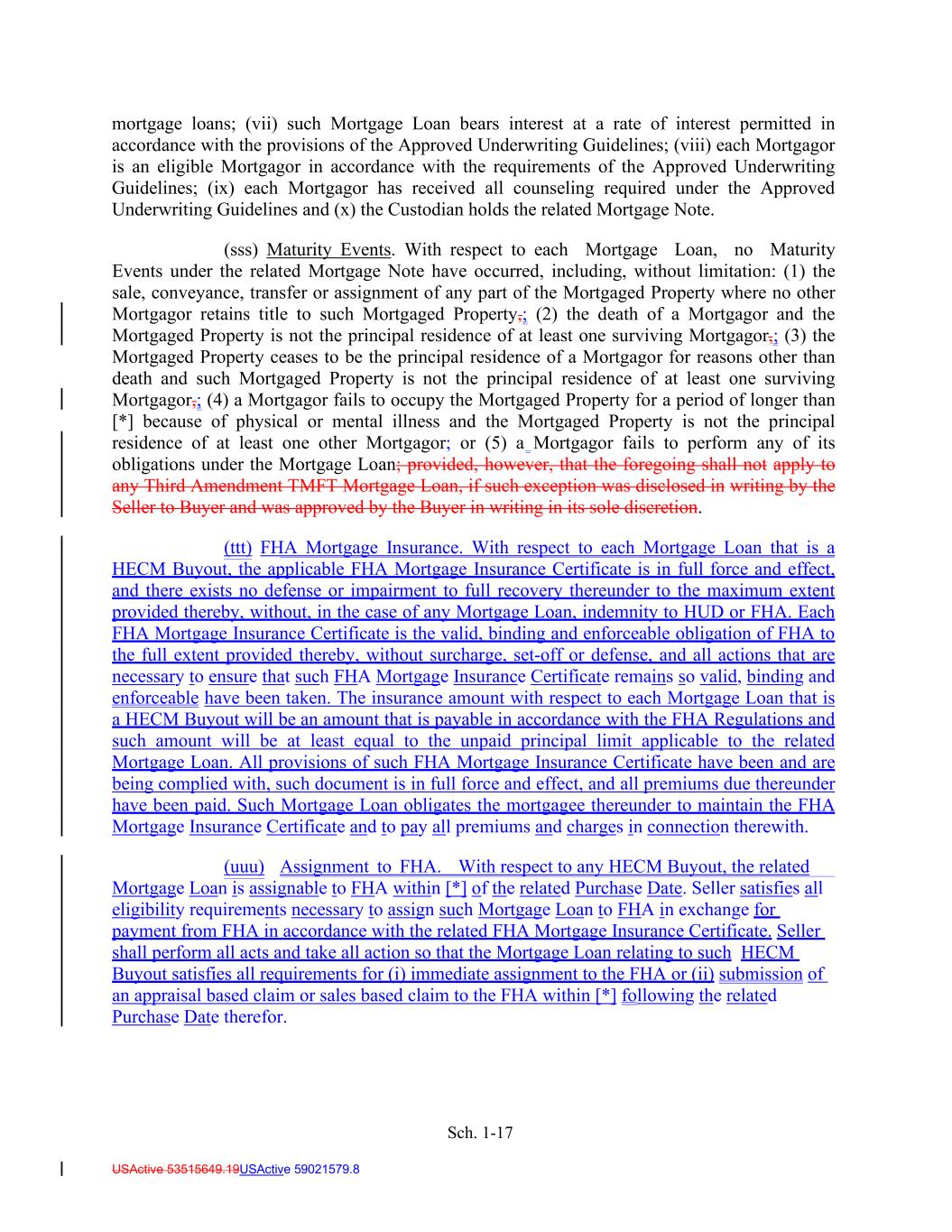 Sch. 1-17 USActive 53515649.19USActive 59021579.8 mortgage loans; (vii) such Mortgage Loan bears interest at a rate of interest permitted in accordance with the provisions of the Approved Underwriting Guidelines; (viii) each Mortgagor is an eligible Mortgagor in accordance with the requirements of the Approved Underwriting Guidelines; (ix) each Mortgagor has received all counseling required under the Approved Underwriting Guidelines and (x) the Custodian holds the related Mortgage Note. (sss) Maturity Events. With respect to each Mortgage Loan, no Maturity Events under the related Mortgage Note have occurred, including, without limitation: (1) the sale, conveyance, transfer or assignment of any part of the Mortgaged Property where no other Mortgagor retains title to such Mortgaged Property,; (2) the death of a Mortgagor and the Mortgaged Property is not the principal residence of at least one surviving Mortgagor,; (3) the Mortgaged Property ceases to be the principal residence of a Mortgagor for reasons other than death and such Mortgaged Property is not the principal residence of at least one surviving Mortgagor,; (4) a Mortgagor fails to occupy the Mortgaged Property for a period of longer than [*] because of physical or mental illness and the Mortgaged Property is not the principal residence of at least one other Mortgagor; or (5) a Mortgagor fails to perform any of its obligations under the Mortgage Loan; provided, however, that the foregoing shall not apply to any Third Amendment TMFT Mortgage Loan, if such exception was disclosed in writing by the Seller to Buyer and was approved by the Buyer in writing in its sole discretion. (ttt) FHA Mortgage Insurance. With respect to each Mortgage Loan that is a HECM Buyout, the applicable FHA Mortgage Insurance Certificate is in full force and effect, and there exists no defense or impairment to full recovery thereunder to the maximum extent provided thereby, without, in the case of any Mortgage Loan, indemnity to HUD or FHA. Each FHA Mortgage Insurance Certificate is the valid, binding and enforceable obligation of FHA to the full extent provided thereby, without surcharge, set-off or defense, and all actions that are necessary to ensure that such FHA Mortgage Insurance Certificate remains so valid, binding and enforceable have been taken. The insurance amount with respect to each Mortgage Loan that is a HECM Buyout will be an amount that is payable in accordance with the FHA Regulations and such amount will be at least equal to the unpaid principal limit applicable to the related Mortgage Loan. All provisions of such FHA Mortgage Insurance Certificate have been and are being complied with, such document is in full force and effect, and all premiums due thereunder have been paid. Such Mortgage Loan obligates the mortgagee thereunder to maintain the FHA Mortgage Insurance Certificate and to pay all premiums and charges in connection therewith. (uuu) Assignment to FHA. With respect to any HECM Buyout, the related Mortgage Loan is assignable to FHA within [*] of the related Purchase Date. Seller satisfies all eligibility requirements necessary to assign such Mortgage Loan to FHA in exchange for payment from FHA in accordance with the related FHA Mortgage Insurance Certificate. Seller shall perform all acts and take all action so that the Mortgage Loan relating to such HECM Buyout satisfies all requirements for (i) immediate assignment to the FHA or (ii) submission of an appraisal based claim or sales based claim to the FHA within [*] following the related Purchase Date therefor.