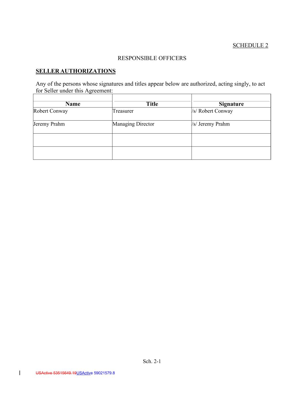 Sch. 2-1 USActive 53515649.19USActive 59021579.8 SELLER AUTHORIZATIONS RESPONSIBLE OFFICERS SCHEDULE 2 Any of the persons whose signatures and titles appear below are authorized, acting singly, to act for Seller under this Agreement: Title Signature Name Robert Conway Treasurer /s/ Robert Conway Jeremy Prahm Managing Director /s/ Jeremy Prahm