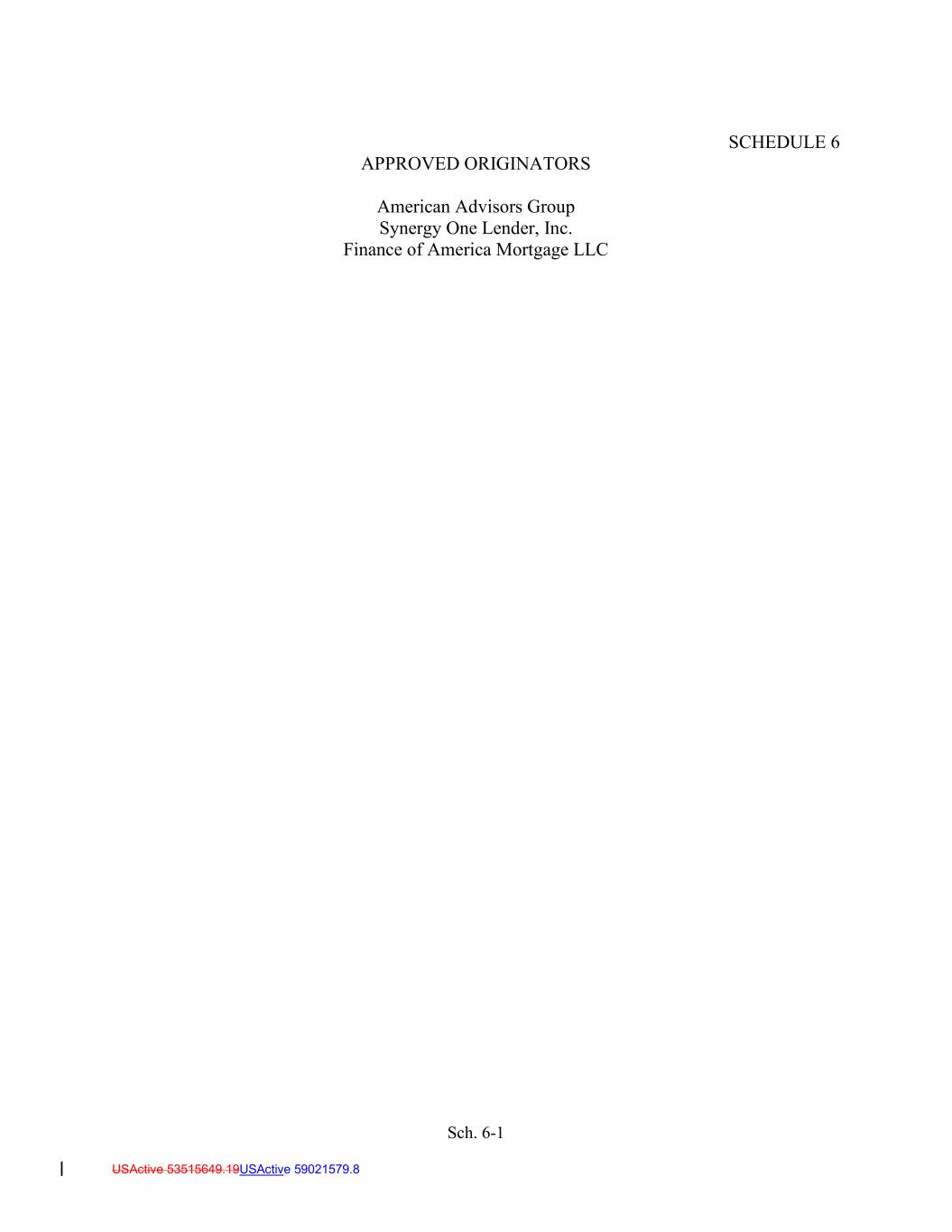 Sch. 6-1 USActive 53515649.19USActive 59021579.8 SCHEDULE 6 APPROVED ORIGINATORS American Advisors Group Synergy One Lender, Inc. Finance of America Mortgage LLC