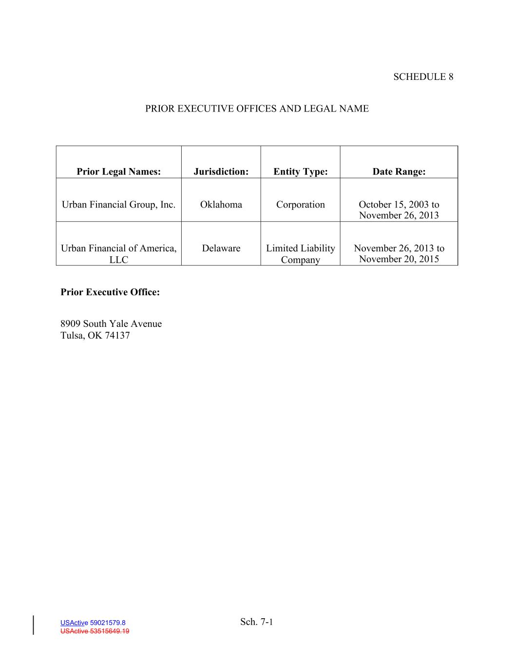 Sch. 7-1 USActive 59021579.8 USActive 53515649.19 SCHEDULE 8 PRIOR EXECUTIVE OFFICES AND LEGAL NAME Prior Legal Names: Jurisdiction: Entity Type: Date Range: Urban Financial Group, Inc. Oklahoma Corporation October 15, 2003 to November 26, 2013 Urban Financial of America, LLC Delaware Limited Liability Company November 26, 2013 to November 20, 2015 Prior Executive Office: 8909 South Yale Avenue Tulsa, OK 74137