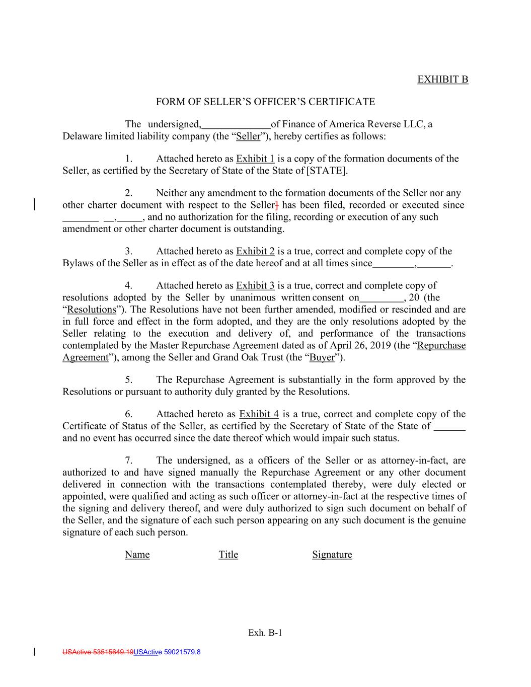 Exh. B-1 USActive 53515649.19USActive 59021579.8 EXHIBIT B FORM OF SELLER’S OFFICER’S CERTIFICATE The undersigned, of Finance of America Reverse LLC, a Delaware limited liability company (the “Seller”), hereby certifies as follows: 1. Attached hereto as Exhibit 1 is a copy of the formation documents of the Seller, as certified by the Secretary of State of the State of [STATE]. 2. Neither any amendment to the formation documents of the Seller nor any other charter document with respect to the Seller] has been filed, recorded or executed since , , and no authorization for the filing, recording or execution of any such amendment or other charter document is outstanding. 3. Attached hereto as Exhibit 2 is a true, correct and complete copy of the Bylaws of the Seller as in effect as of the date hereof and at all times since , . 4. Attached hereto as Exhibit 3 is a true, correct and complete copy of resolutions adopted by the Seller by unanimous written consent on , 20 (the “Resolutions”). The Resolutions have not been further amended, modified or rescinded and are in full force and effect in the form adopted, and they are the only resolutions adopted by the Seller relating to the execution and delivery of, and performance of the transactions contemplated by the Master Repurchase Agreement dated as of April 26, 2019 (the “Repurchase Agreement”), among the Seller and Grand Oak Trust (the “Buyer”). 5. The Repurchase Agreement is substantially in the form approved by the Resolutions or pursuant to authority duly granted by the Resolutions. 6. Attached hereto as Exhibit 4 is a true, correct and complete copy of the Certificate of Status of the Seller, as certified by the Secretary of State of the State of and no event has occurred since the date thereof which would impair such status. 7. The undersigned, as a officers of the Seller or as attorney-in-fact, are authorized to and have signed manually the Repurchase Agreement or any other document delivered in connection with the transactions contemplated thereby, were duly elected or appointed, were qualified and acting as such officer or attorney-in-fact at the respective times of the signing and delivery thereof, and were duly authorized to sign such document on behalf of the Seller, and the signature of each such person appearing on any such document is the genuine signature of each such person. Name Title Signature