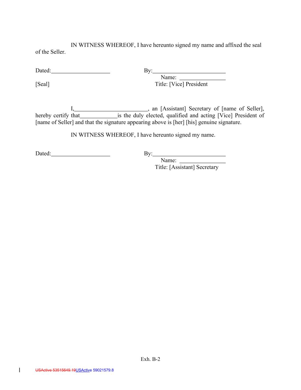 Exh. B-2 USActive 53515649.19USActive 59021579.8 IN WITNESS WHEREOF, I have hereunto signed my name and affixed the seal of the Seller. Dated: [Seal] By: Name: Title: [Vice] President I, , an [Assistant] Secretary of [name of Seller], hereby certify that is the duly elected, qualified and acting [Vice] President of [name of Seller] and that the signature appearing above is [her] [his] genuine signature. IN WITNESS WHEREOF, I have hereunto signed my name. Dated: By: Name: Title: [Assistant] Secretary