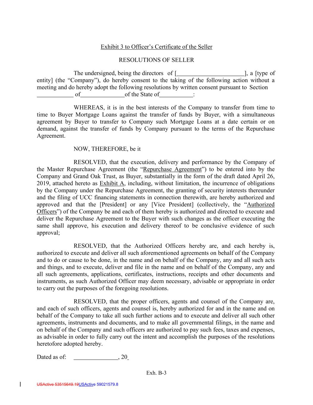 USActive 53515649.19USActive 59021579.8 Exhibit 3 to Officer’s Certificate of the Seller RESOLUTIONS OF SELLER The undersigned, being the directors of [ ], a [type of entity] (the “Company”), do hereby consent to the taking of the following action without a meeting and do hereby adopt the following resolutions by written consent pursuant to Section of of the State of : WHEREAS, it is in the best interests of the Company to transfer from time to time to Buyer Mortgage Loans against the transfer of funds by Buyer, with a simultaneous agreement by Buyer to transfer to Company such Mortgage Loans at a date certain or on demand, against the transfer of funds by Company pursuant to the terms of the Repurchase Agreement. NOW, THEREFORE, be it RESOLVED, that the execution, delivery and performance by the Company of the Master Repurchase Agreement (the “Repurchase Agreement”) to be entered into by the Company and Grand Oak Trust, as Buyer, substantially in the form of the draft dated April 26, 2019, attached hereto as Exhibit A, including, without limitation, the incurrence of obligations by the Company under the Repurchase Agreement, the granting of security interests thereunder and the filing of UCC financing statements in connection therewith, are hereby authorized and approved and that the [President] or any [Vice President] (collectively, the “Authorized Officers”) of the Company be and each of them hereby is authorized and directed to execute and deliver the Repurchase Agreement to the Buyer with such changes as the officer executing the same shall approve, his execution and delivery thereof to be conclusive evidence of such approval; RESOLVED, that the Authorized Officers hereby are, and each hereby is, authorized to execute and deliver all such aforementioned agreements on behalf of the Company and to do or cause to be done, in the name and on behalf of the Company, any and all such acts and things, and to execute, deliver and file in the name and on behalf of the Company, any and all such agreements, applications, certificates, instructions, receipts and other documents and instruments, as such Authorized Officer may deem necessary, advisable or appropriate in order to carry out the purposes of the foregoing resolutions. RESOLVED, that the proper officers, agents and counsel of the Company are, and each of such officers, agents and counsel is, hereby authorized for and in the name and on behalf of the Company to take all such further actions and to execute and deliver all such other agreements, instruments and documents, and to make all governmental filings, in the name and on behalf of the Company and such officers are authorized to pay such fees, taxes and expenses, as advisable in order to fully carry out the intent and accomplish the purposes of the resolutions heretofore adopted hereby. Dated as of: , 20 Exh. B-3