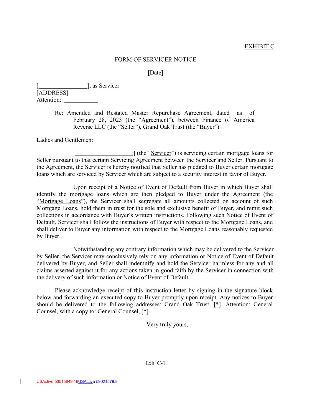 USActive 53515649.19USActive 59021579.8 EXHIBIT C FORM OF SERVICER NOTICE [Date] [ ], as Servicer [ADDRESS] Attention: Re: Amended and Restated Master Repurchase Agreement, dated as of February 28, 2023 (the “Agreement”), between Finance of America Reverse LLC (the “Seller”), Grand Oak Trust (the “Buyer”). Ladies and Gentlemen: [ ] (the “Servicer”) is servicing certain mortgage loans for Seller pursuant to that certain Servicing Agreement between the Servicer and Seller. Pursuant to the Agreement, the Servicer is hereby notified that Seller has pledged to Buyer certain mortgage loans which are serviced by Servicer which are subject to a security interest in favor of Buyer. Upon receipt of a Notice of Event of Default from Buyer in which Buyer shall identify the mortgage loans which are then pledged to Buyer under the Agreement (the “Mortgage Loans”), the Servicer shall segregate all amounts collected on account of such Mortgage Loans, hold them in trust for the sole and exclusive benefit of Buyer, and remit such collections in accordance with Buyer’s written instructions. Following such Notice of Event of Default, Servicer shall follow the instructions of Buyer with respect to the Mortgage Loans, and shall deliver to Buyer any information with respect to the Mortgage Loans reasonably requested by Buyer. Notwithstanding any contrary information which may be delivered to the Servicer by Seller, the Servicer may conclusively rely on any information or Notice of Event of Default delivered by Buyer, and Seller shall indemnify and hold the Servicer harmless for any and all claims asserted against it for any actions taken in good faith by the Servicer in connection with the delivery of such information or Notice of Event of Default. Please acknowledge receipt of this instruction letter by signing in the signature block below and forwarding an executed copy to Buyer promptly upon receipt. Any notices to Buyer should be delivered to the following addresses: Grand Oak Trust, [*], Attention: General Counsel, with a copy to: General Counsel, [*]. Very truly yours, Exh. C-1