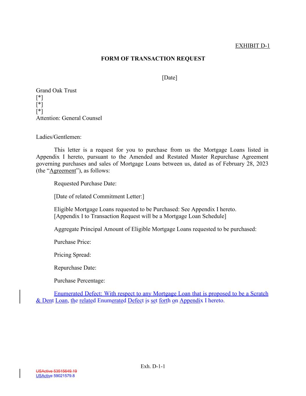USActive 53515649.19 USActive 59021579.8 EXHIBIT D-1 FORM OF TRANSACTION REQUEST [Date] Grand Oak Trust [*] [*] [*] Attention: General Counsel Ladies/Gentlemen: This letter is a request for you to purchase from us the Mortgage Loans listed in Appendix I hereto, pursuant to the Amended and Restated Master Repurchase Agreement governing purchases and sales of Mortgage Loans between us, dated as of February 28, 2023 (the “Agreement”), as follows: Requested Purchase Date: [Date of related Commitment Letter:] Eligible Mortgage Loans requested to be Purchased: See Appendix I hereto. [Appendix I to Transaction Request will be a Mortgage Loan Schedule] Aggregate Principal Amount of Eligible Mortgage Loans requested to be purchased: Purchase Price: Pricing Spread: Repurchase Date: Purchase Percentage: Enumerated Defect: With respect to any Mortgage Loan that is proposed to be a Scratch & Dent Loan, the related Enumerated Defect is set forth on Appendix I hereto. Exh. D-1-1