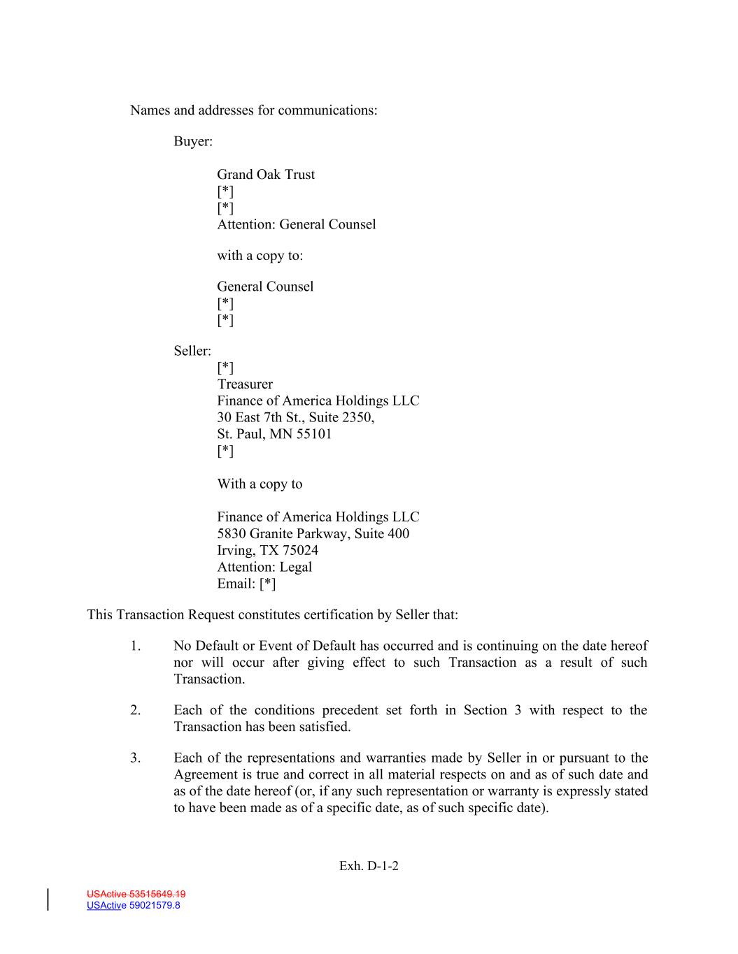 USActive 53515649.19 USActive 59021579.8 Names and addresses for communications: Buyer: Seller: Grand Oak Trust [*] [*] Attention: General Counsel with a copy to: General Counsel [*] [*] [*] Treasurer Finance of America Holdings LLC 30 East 7th St., Suite 2350, St. Paul, MN 55101 [*] With a copy to Finance of America Holdings LLC 5830 Granite Parkway, Suite 400 Irving, TX 75024 Attention: Legal Email: [*] This Transaction Request constitutes certification by Seller that: 1. No Default or Event of Default has occurred and is continuing on the date hereof nor will occur after giving effect to such Transaction as a result of such Transaction. 2. Each of the conditions precedent set forth in Section 3 with respect to the Transaction has been satisfied. 3. Each of the representations and warranties made by Seller in or pursuant to the Agreement is true and correct in all material respects on and as of such date and as of the date hereof (or, if any such representation or warranty is expressly stated to have been made as of a specific date, as of such specific date). Exh. D-1-2
