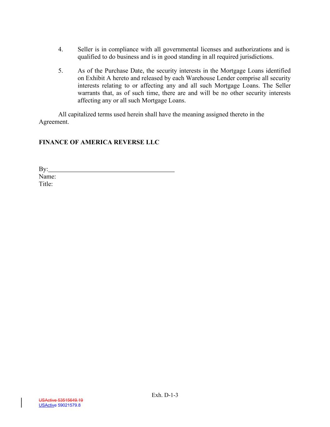USActive 53515649.19 USActive 59021579.8 4. Seller is in compliance with all governmental licenses and authorizations and is qualified to do business and is in good standing in all required jurisdictions. 5. As of the Purchase Date, the security interests in the Mortgage Loans identified on Exhibit A hereto and released by each Warehouse Lender comprise all security interests relating to or affecting any and all such Mortgage Loans. The Seller warrants that, as of such time, there are and will be no other security interests affecting any or all such Mortgage Loans. All capitalized terms used herein shall have the meaning assigned thereto in the Agreement. FINANCE OF AMERICA REVERSE LLC By: Name: Title: Exh. D-1-3
