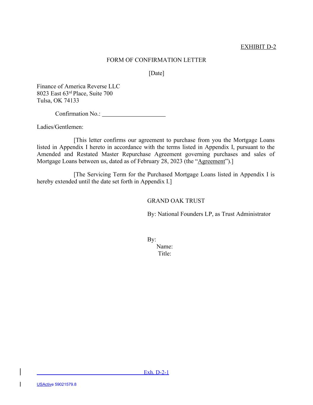 USActive 59021579.8 EXHIBIT D-2 FORM OF CONFIRMATION LETTER [Date] Finance of America Reverse LLC 8023 East 63rd Place, Suite 700 Tulsa, OK 74133 Confirmation No.: Ladies/Gentlemen: [This letter confirms our agreement to purchase from you the Mortgage Loans listed in Appendix I hereto in accordance with the terms listed in Appendix I, pursuant to the Amended and Restated Master Repurchase Agreement governing purchases and sales of Mortgage Loans between us, dated as of February 28, 2023 (the “Agreement”).] [The Servicing Term for the Purchased Mortgage Loans listed in Appendix I is hereby extended until the date set forth in Appendix I.] GRAND OAK TRUST By: National Founders LP, as Trust Administrator By: Name: Title: Exh. D-2-1