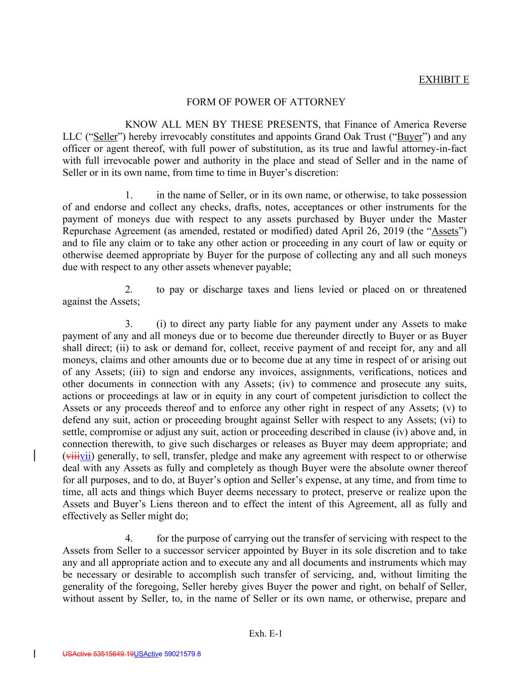 Exh. E-1 USActive 53515649.19USActive 59021579.8 EXHIBIT E FORM OF POWER OF ATTORNEY KNOW ALL MEN BY THESE PRESENTS, that Finance of America Reverse LLC (“Seller”) hereby irrevocably constitutes and appoints Grand Oak Trust (“Buyer”) and any officer or agent thereof, with full power of substitution, as its true and lawful attorney-in-fact with full irrevocable power and authority in the place and stead of Seller and in the name of Seller or in its own name, from time to time in Buyer’s discretion: 1. in the name of Seller, or in its own name, or otherwise, to take possession of and endorse and collect any checks, drafts, notes, acceptances or other instruments for the payment of moneys due with respect to any assets purchased by Buyer under the Master Repurchase Agreement (as amended, restated or modified) dated April 26, 2019 (the “Assets”) and to file any claim or to take any other action or proceeding in any court of law or equity or otherwise deemed appropriate by Buyer for the purpose of collecting any and all such moneys due with respect to any other assets whenever payable; 2. to pay or discharge taxes and liens levied or placed on or threatened against the Assets; 3. (i) to direct any party liable for any payment under any Assets to make payment of any and all moneys due or to become due thereunder directly to Buyer or as Buyer shall direct; (ii) to ask or demand for, collect, receive payment of and receipt for, any and all moneys, claims and other amounts due or to become due at any time in respect of or arising out of any Assets; (iii) to sign and endorse any invoices, assignments, verifications, notices and other documents in connection with any Assets; (iv) to commence and prosecute any suits, actions or proceedings at law or in equity in any court of competent jurisdiction to collect the Assets or any proceeds thereof and to enforce any other right in respect of any Assets; (v) to defend any suit, action or proceeding brought against Seller with respect to any Assets; (vi) to settle, compromise or adjust any suit, action or proceeding described in clause (iv) above and, in connection therewith, to give such discharges or releases as Buyer may deem appropriate; and (viiivii) generally, to sell, transfer, pledge and make any agreement with respect to or otherwise deal with any Assets as fully and completely as though Buyer were the absolute owner thereof for all purposes, and to do, at Buyer’s option and Seller’s expense, at any time, and from time to time, all acts and things which Buyer deems necessary to protect, preserve or realize upon the Assets and Buyer’s Liens thereon and to effect the intent of this Agreement, all as fully and effectively as Seller might do; 4. for the purpose of carrying out the transfer of servicing with respect to the Assets from Seller to a successor servicer appointed by Buyer in its sole discretion and to take any and all appropriate action and to execute any and all documents and instruments which may be necessary or desirable to accomplish such transfer of servicing, and, without limiting the generality of the foregoing, Seller hereby gives Buyer the power and right, on behalf of Seller, without assent by Seller, to, in the name of Seller or its own name, or otherwise, prepare and