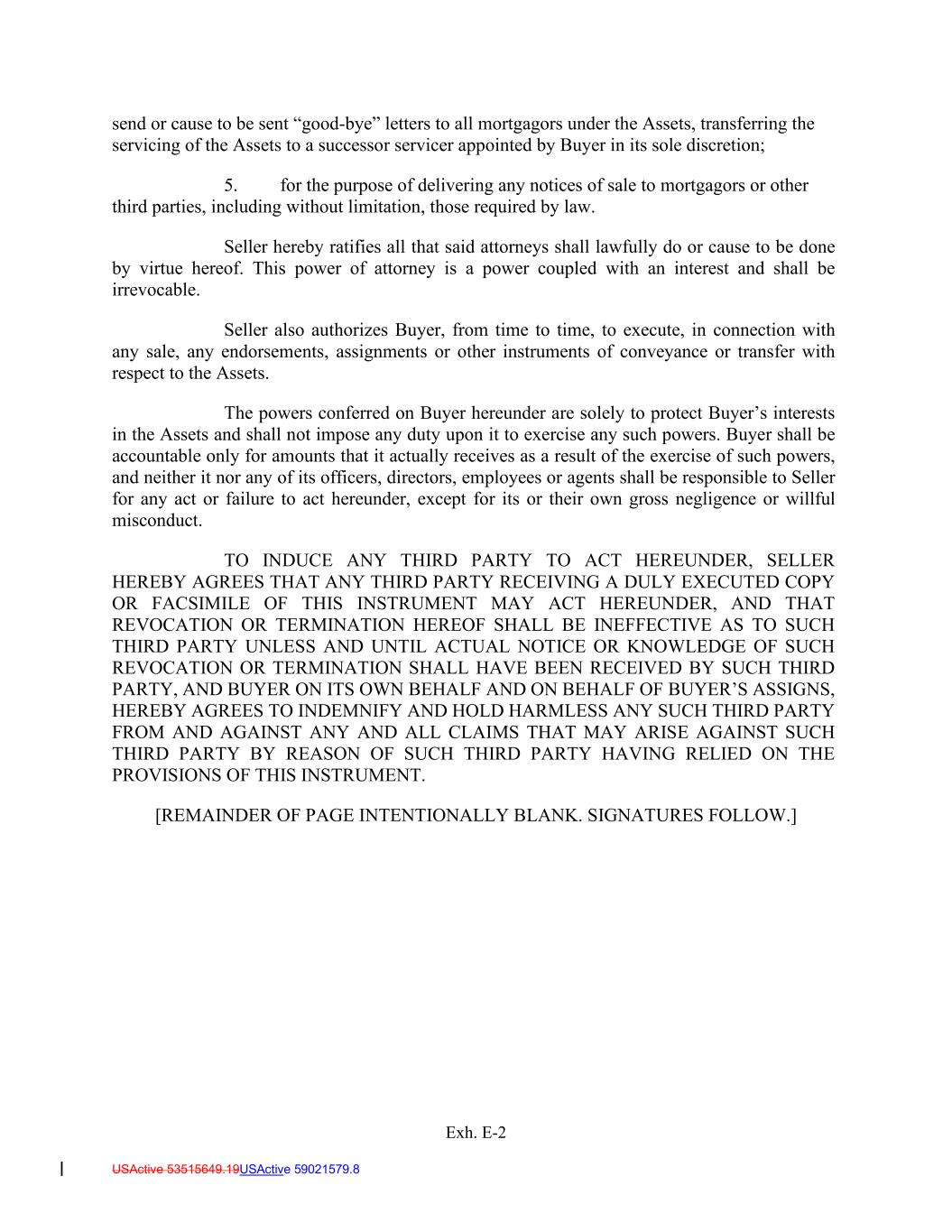 USActive 53515649.19USActive 59021579.8 send or cause to be sent “good-bye” letters to all mortgagors under the Assets, transferring the servicing of the Assets to a successor servicer appointed by Buyer in its sole discretion; 5. for the purpose of delivering any notices of sale to mortgagors or other third parties, including without limitation, those required by law. Seller hereby ratifies all that said attorneys shall lawfully do or cause to be done by virtue hereof. This power of attorney is a power coupled with an interest and shall be irrevocable. Seller also authorizes Buyer, from time to time, to execute, in connection with any sale, any endorsements, assignments or other instruments of conveyance or transfer with respect to the Assets. The powers conferred on Buyer hereunder are solely to protect Buyer’s interests in the Assets and shall not impose any duty upon it to exercise any such powers. Buyer shall be accountable only for amounts that it actually receives as a result of the exercise of such powers, and neither it nor any of its officers, directors, employees or agents shall be responsible to Seller for any act or failure to act hereunder, except for its or their own gross negligence or willful misconduct. TO INDUCE ANY THIRD PARTY TO ACT HEREUNDER, SELLER HEREBY AGREES THAT ANY THIRD PARTY RECEIVING A DULY EXECUTED COPY OR FACSIMILE OF THIS INSTRUMENT MAY ACT HEREUNDER, AND THAT REVOCATION OR TERMINATION HEREOF SHALL BE INEFFECTIVE AS TO SUCH THIRD PARTY UNLESS AND UNTIL ACTUAL NOTICE OR KNOWLEDGE OF SUCH REVOCATION OR TERMINATION SHALL HAVE BEEN RECEIVED BY SUCH THIRD PARTY, AND BUYER ON ITS OWN BEHALF AND ON BEHALF OF BUYER’S ASSIGNS, HEREBY AGREES TO INDEMNIFY AND HOLD HARMLESS ANY SUCH THIRD PARTY FROM AND AGAINST ANY AND ALL CLAIMS THAT MAY ARISE AGAINST SUCH THIRD PARTY BY REASON OF SUCH THIRD PARTY HAVING RELIED ON THE PROVISIONS OF THIS INSTRUMENT. [REMAINDER OF PAGE INTENTIONALLY BLANK. SIGNATURES FOLLOW.] Exh. E-2
