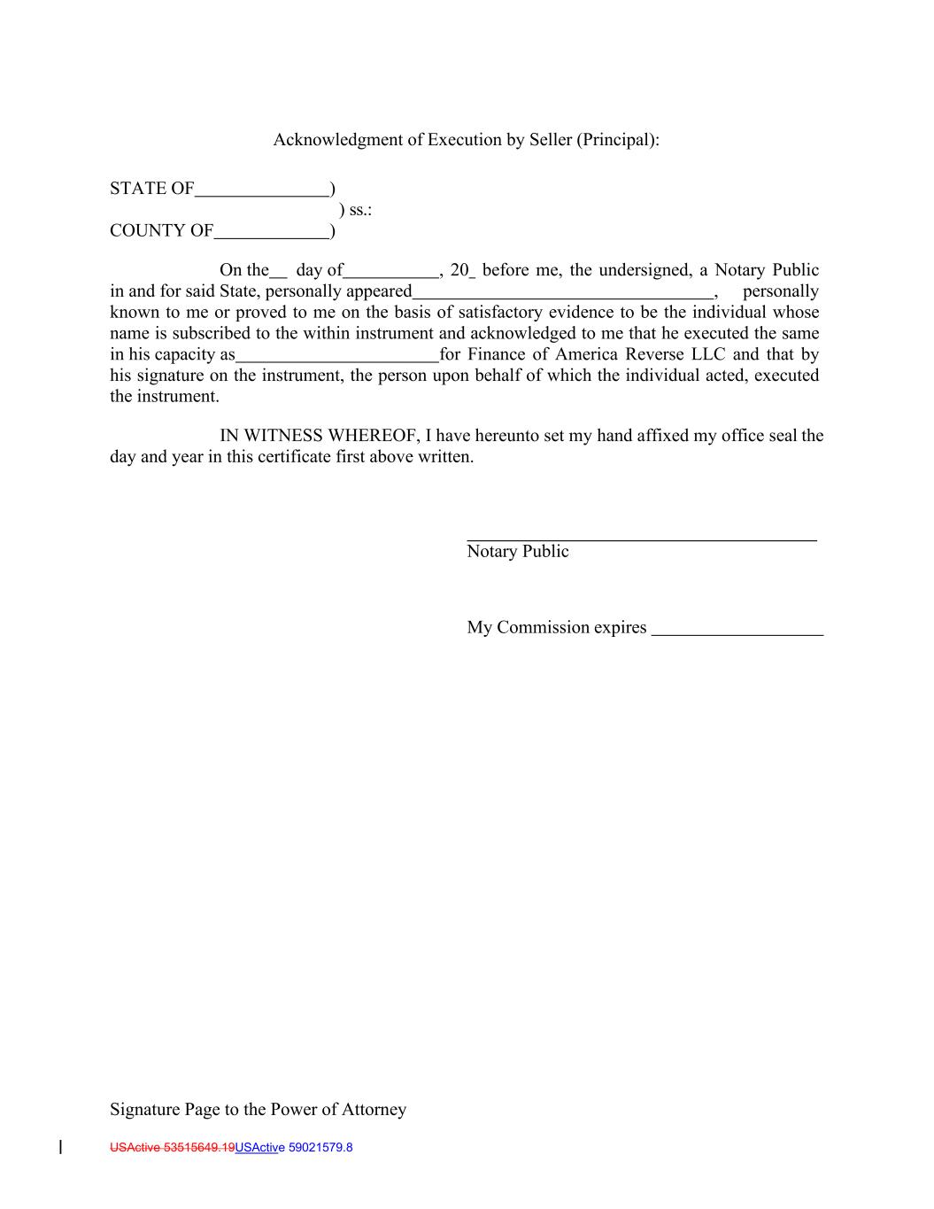Signature Page to the Power of Attorney USActive 53515649.19USActive 59021579.8 Acknowledgment of Execution by Seller (Principal): STATE OF ) ) ss.: COUNTY OF ) On the day of , 20 before me, the undersigned, a Notary Public in and for said State, personally appeared , personally known to me or proved to me on the basis of satisfactory evidence to be the individual whose name is subscribed to the within instrument and acknowledged to me that he executed the same in his capacity as for Finance of America Reverse LLC and that by his signature on the instrument, the person upon behalf of which the individual acted, executed the instrument. IN WITNESS WHEREOF, I have hereunto set my hand affixed my office seal the day and year in this certificate first above written. Notary Public My Commission expires
