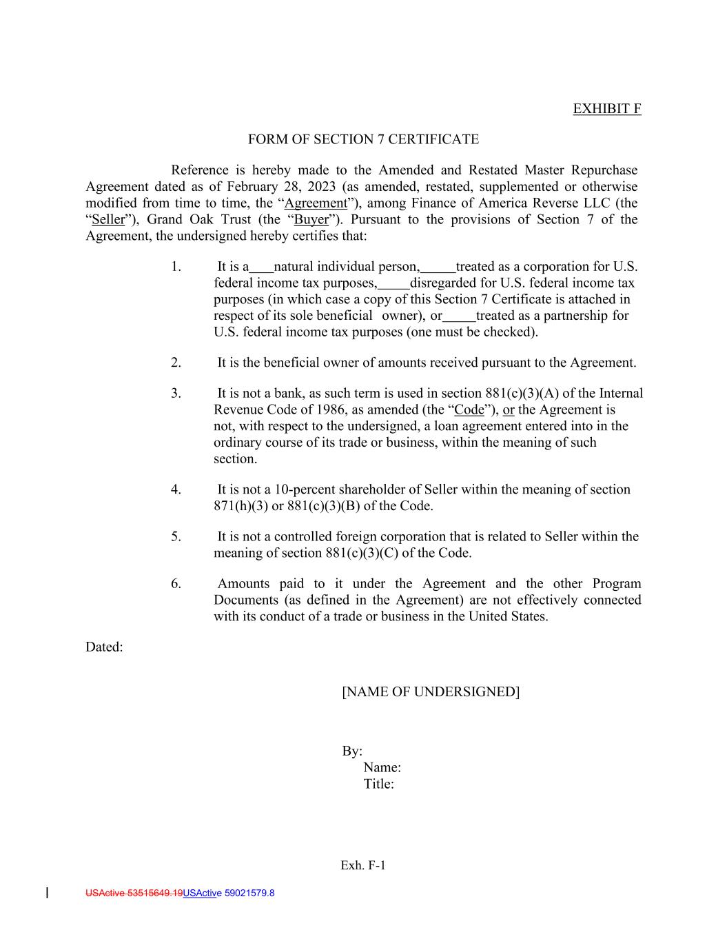 USActive 53515649.19USActive 59021579.8 EXHIBIT F FORM OF SECTION 7 CERTIFICATE Reference is hereby made to the Amended and Restated Master Repurchase Agreement dated as of February 28, 2023 (as amended, restated, supplemented or otherwise modified from time to time, the “Agreement”), among Finance of America Reverse LLC (the “Seller”), Grand Oak Trust (the “Buyer”). Pursuant to the provisions of Section 7 of the Agreement, the undersigned hereby certifies that: 1. It is a natural individual person, treated as a corporation for U.S. federal income tax purposes, disregarded for U.S. federal income tax purposes (in which case a copy of this Section 7 Certificate is attached in respect of its sole beneficial owner), or treated as a partnership for U.S. federal income tax purposes (one must be checked). 2. It is the beneficial owner of amounts received pursuant to the Agreement. 3. It is not a bank, as such term is used in section 881(c)(3)(A) of the Internal Revenue Code of 1986, as amended (the “Code”), or the Agreement is not, with respect to the undersigned, a loan agreement entered into in the ordinary course of its trade or business, within the meaning of such section. 4. It is not a 10-percent shareholder of Seller within the meaning of section 871(h)(3) or 881(c)(3)(B) of the Code. 5. It is not a controlled foreign corporation that is related to Seller within the meaning of section 881(c)(3)(C) of the Code. 6. Amounts paid to it under the Agreement and the other Program Documents (as defined in the Agreement) are not effectively connected with its conduct of a trade or business in the United States. Dated: [NAME OF UNDERSIGNED] By: Name: Title: Exh. F-1