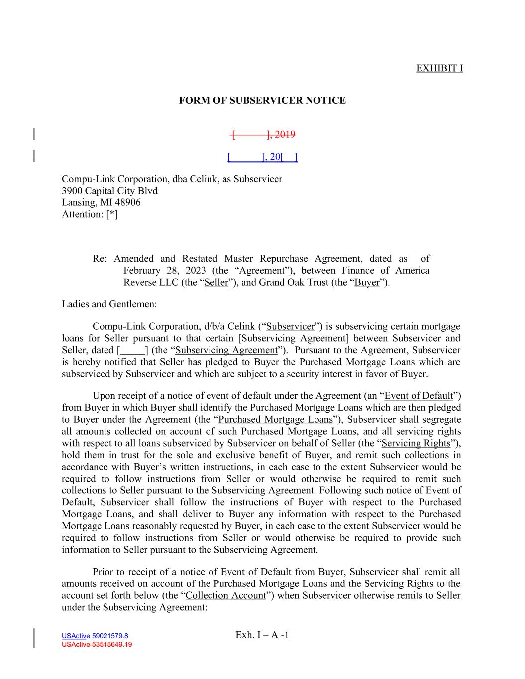 Exh. I – A -1 USActive 59021579.8 USActive 53515649.19 EXHIBIT I FORM OF SUBSERVICER NOTICE [ ], 2019 [ ], 20[ ] Compu-Link Corporation, dba Celink, as Subservicer 3900 Capital City Blvd Lansing, MI 48906 Attention: [*] Re: Amended and Restated Master Repurchase Agreement, dated as of February 28, 2023 (the “Agreement”), between Finance of America Reverse LLC (the “Seller”), and Grand Oak Trust (the “Buyer”). Ladies and Gentlemen: Compu-Link Corporation, d/b/a Celink (“Subservicer”) is subservicing certain mortgage loans for Seller pursuant to that certain [Subservicing Agreement] between Subservicer and Seller, dated [ ] (the “Subservicing Agreement”). Pursuant to the Agreement, Subservicer is hereby notified that Seller has pledged to Buyer the Purchased Mortgage Loans which are subserviced by Subservicer and which are subject to a security interest in favor of Buyer. Upon receipt of a notice of event of default under the Agreement (an “Event of Default”) from Buyer in which Buyer shall identify the Purchased Mortgage Loans which are then pledged to Buyer under the Agreement (the “Purchased Mortgage Loans”), Subservicer shall segregate all amounts collected on account of such Purchased Mortgage Loans, and all servicing rights with respect to all loans subserviced by Subservicer on behalf of Seller (the “Servicing Rights”), hold them in trust for the sole and exclusive benefit of Buyer, and remit such collections in accordance with Buyer’s written instructions, in each case to the extent Subservicer would be required to follow instructions from Seller or would otherwise be required to remit such collections to Seller pursuant to the Subservicing Agreement. Following such notice of Event of Default, Subservicer shall follow the instructions of Buyer with respect to the Purchased Mortgage Loans, and shall deliver to Buyer any information with respect to the Purchased Mortgage Loans reasonably requested by Buyer, in each case to the extent Subservicer would be required to follow instructions from Seller or would otherwise be required to provide such information to Seller pursuant to the Subservicing Agreement. Prior to receipt of a notice of Event of Default from Buyer, Subservicer shall remit all amounts received on account of the Purchased Mortgage Loans and the Servicing Rights to the account set forth below (the “Collection Account”) when Subservicer otherwise remits to Seller under the Subservicing Agreement:
