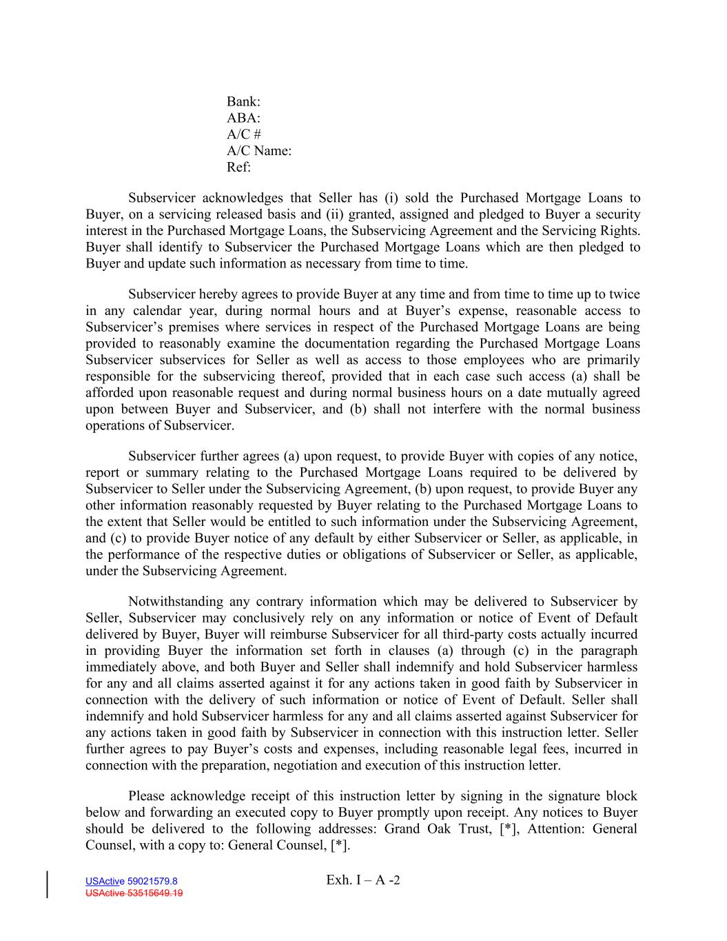 Exh. I – A -2 USActive 59021579.8 USActive 53515649.19 Bank: ABA: A/C # A/C Name: Ref: Subservicer acknowledges that Seller has (i) sold the Purchased Mortgage Loans to Buyer, on a servicing released basis and (ii) granted, assigned and pledged to Buyer a security interest in the Purchased Mortgage Loans, the Subservicing Agreement and the Servicing Rights. Buyer shall identify to Subservicer the Purchased Mortgage Loans which are then pledged to Buyer and update such information as necessary from time to time. Subservicer hereby agrees to provide Buyer at any time and from time to time up to twice in any calendar year, during normal hours and at Buyer’s expense, reasonable access to Subservicer’s premises where services in respect of the Purchased Mortgage Loans are being provided to reasonably examine the documentation regarding the Purchased Mortgage Loans Subservicer subservices for Seller as well as access to those employees who are primarily responsible for the subservicing thereof, provided that in each case such access (a) shall be afforded upon reasonable request and during normal business hours on a date mutually agreed upon between Buyer and Subservicer, and (b) shall not interfere with the normal business operations of Subservicer. Subservicer further agrees (a) upon request, to provide Buyer with copies of any notice, report or summary relating to the Purchased Mortgage Loans required to be delivered by Subservicer to Seller under the Subservicing Agreement, (b) upon request, to provide Buyer any other information reasonably requested by Buyer relating to the Purchased Mortgage Loans to the extent that Seller would be entitled to such information under the Subservicing Agreement, and (c) to provide Buyer notice of any default by either Subservicer or Seller, as applicable, in the performance of the respective duties or obligations of Subservicer or Seller, as applicable, under the Subservicing Agreement. Notwithstanding any contrary information which may be delivered to Subservicer by Seller, Subservicer may conclusively rely on any information or notice of Event of Default delivered by Buyer, Buyer will reimburse Subservicer for all third-party costs actually incurred in providing Buyer the information set forth in clauses (a) through (c) in the paragraph immediately above, and both Buyer and Seller shall indemnify and hold Subservicer harmless for any and all claims asserted against it for any actions taken in good faith by Subservicer in connection with the delivery of such information or notice of Event of Default. Seller shall indemnify and hold Subservicer harmless for any and all claims asserted against Subservicer for any actions taken in good faith by Subservicer in connection with this instruction letter. Seller further agrees to pay Buyer’s costs and expenses, including reasonable legal fees, incurred in connection with the preparation, negotiation and execution of this instruction letter. Please acknowledge receipt of this instruction letter by signing in the signature block below and forwarding an executed copy to Buyer promptly upon receipt. Any notices to Buyer should be delivered to the following addresses: Grand Oak Trust, [*], Attention: General Counsel, with a copy to: General Counsel, [*].
