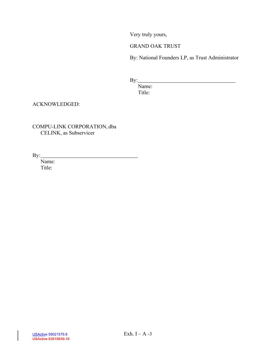 Exh. I – A -3 USActive 59021579.8 USActive 53515649.19 Very truly yours, GRAND OAK TRUST By: National Founders LP, as Trust Administrator ACKNOWLEDGED: COMPU-LINK CORPORATION, dba CELINK, as Subservicer By: Name: Title: By: Name: Title:
