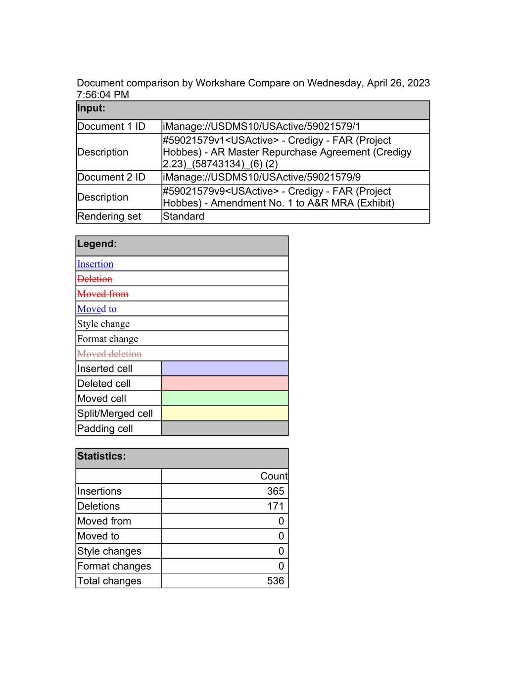 Document comparison by Workshare Compare on Wednesday, April 26, 2023 7:56:04 PM Input: Document 1 ID iManage://USDMS10/USActive/59021579/1 Description #59021579v1<USActive> - Credigy - FAR (Project Hobbes) - AR Master Repurchase Agreement (Credigy 2.23)_(58743134)_(6) (2) Document 2 ID iManage://USDMS10/USActive/59021579/9 Description #59021579v9<USActive> - Credigy - FAR (Project Hobbes) - Amendment No. 1 to A&R MRA (Exhibit) Rendering set Standard Legend: Insertion Deletion Moved from Moved to Style change Format change Moved deletion Inserted cell Deleted cell Moved cell Split/Merged cell Padding cell Statistics: Count Insertions 365 Deletions 171 Moved from 0 Moved to 0 Style changes 0 Format changes 0 Total changes 536