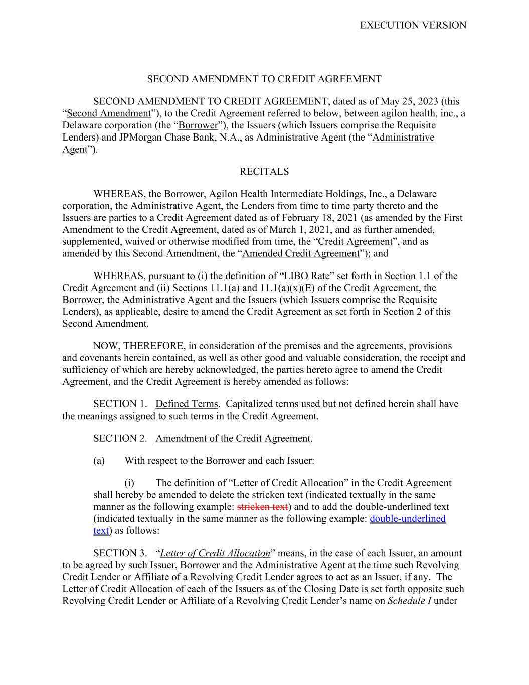 EXECUTION VERSION SECOND AMENDMENT TO CREDIT AGREEMENT SECOND AMENDMENT TO CREDIT AGREEMENT, dated as of May 25, 2023 (this “Second Amendment”), to the Credit Agreement referred to below, between agilon health, inc., a Delaware corporation (the “Borrower”), the Issuers (which Issuers comprise the Requisite Lenders) and JPMorgan Chase Bank, N.A., as Administrative Agent (the “Administrative Agent”). RECITALS WHEREAS, the Borrower, Agilon Health Intermediate Holdings, Inc., a Delaware corporation, the Administrative Agent, the Lenders from time to time party thereto and the Issuers are parties to a Credit Agreement dated as of February 18, 2021 (as amended by the First Amendment to the Credit Agreement, dated as of March 1, 2021, and as further amended, supplemented, waived or otherwise modified from time, the “Credit Agreement”, and as amended by this Second Amendment, the “Amended Credit Agreement”); and WHEREAS, pursuant to (i) the definition of “LIBO Rate” set forth in Section 1.1 of the Credit Agreement and (ii) Sections 11.1(a) and 11.1(a)(x)(E) of the Credit Agreement, the Borrower, the Administrative Agent and the Issuers (which Issuers comprise the Requisite Lenders), as applicable, desire to amend the Credit Agreement as set forth in Section 2 of this Second Amendment. NOW, THEREFORE, in consideration of the premises and the agreements, provisions and covenants herein contained, as well as other good and valuable consideration, the receipt and sufficiency of which are hereby acknowledged, the parties hereto agree to amend the Credit Agreement, and the Credit Agreement is hereby amended as follows: SECTION 1. Defined Terms. Capitalized terms used but not defined herein shall have the meanings assigned to such terms in the Credit Agreement. SECTION 2. Amendment of the Credit Agreement. (a) With respect to the Borrower and each Issuer: (i) The definition of “Letter of Credit Allocation” in the Credit Agreement shall hereby be amended to delete the stricken text (indicated textually in the same manner as the following example: stricken text) and to add the double-underlined text (indicated textually in the same manner as the following example: double-underlined text) as follows: SECTION 3. “Letter of Credit Allocation” means, in the case of each Issuer, an amount to be agreed by such Issuer, Borrower and the Administrative Agent at the time such Revolving Credit Lender or Affiliate of a Revolving Credit Lender agrees to act as an Issuer, if any. The Letter of Credit Allocation of each of the Issuers as of the Closing Date is set forth opposite such Revolving Credit Lender or Affiliate of a Revolving Credit Lender’s name on Schedule I under