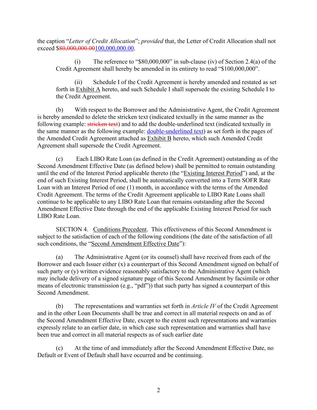 2 the caption “Letter of Credit Allocation”; provided that, the Letter of Credit Allocation shall not exceed $80,000,000.00100,000,000.00. (i) The reference to “$80,000,000” in sub-clause (iv) of Section 2.4(a) of the Credit Agreement shall hereby be amended in its entirety to read “$100,000,000”. (ii) Schedule I of the Credit Agreement is hereby amended and restated as set forth in Exhibit A hereto, and such Schedule I shall supersede the existing Schedule I to the Credit Agreement. (b) With respect to the Borrower and the Administrative Agent, the Credit Agreement is hereby amended to delete the stricken text (indicated textually in the same manner as the following example: stricken text) and to add the double-underlined text (indicated textually in the same manner as the following example: double-underlined text) as set forth in the pages of the Amended Credit Agreement attached as Exhibit B hereto, which such Amended Credit Agreement shall supersede the Credit Agreement. (c) Each LIBO Rate Loan (as defined in the Credit Agreement) outstanding as of the Second Amendment Effective Date (as defined below) shall be permitted to remain outstanding until the end of the Interest Period applicable thereto (the “Existing Interest Period”) and, at the end of such Existing Interest Period, shall be automatically converted into a Term SOFR Rate Loan with an Interest Period of one (1) month, in accordance with the terms of the Amended Credit Agreement. The terms of the Credit Agreement applicable to LIBO Rate Loans shall continue to be applicable to any LIBO Rate Loan that remains outstanding after the Second Amendment Effective Date through the end of the applicable Existing Interest Period for such LIBO Rate Loan. SECTION 4. Conditions Precedent. This effectiveness of this Second Amendment is subject to the satisfaction of each of the following conditions (the date of the satisfaction of all such conditions, the “Second Amendment Effective Date”): (a) The Administrative Agent (or its counsel) shall have received from each of the Borrower and each Issuer either (x) a counterpart of this Second Amendment signed on behalf of such party or (y) written evidence reasonably satisfactory to the Administrative Agent (which may include delivery of a signed signature page of this Second Amendment by facsimile or other means of electronic transmission (e.g., “pdf”)) that such party has signed a counterpart of this Second Amendment. (b) The representations and warranties set forth in Article IV of the Credit Agreement and in the other Loan Documents shall be true and correct in all material respects on and as of the Second Amendment Effective Date, except to the extent such representations and warranties expressly relate to an earlier date, in which case such representation and warranties shall have been true and correct in all material respects as of such earlier date (c) At the time of and immediately after the Second Amendment Effective Date, no Default or Event of Default shall have occurred and be continuing.