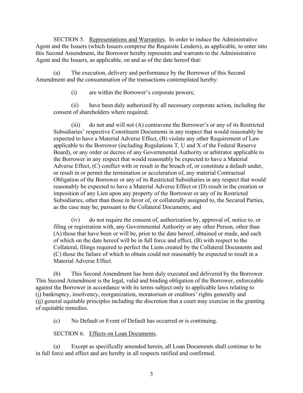 3 SECTION 5. Representations and Warranties. In order to induce the Administrative Agent and the Issuers (which Issuers comprise the Requisite Lenders), as applicable, to enter into this Second Amendment, the Borrower hereby represents and warrants to the Administrative Agent and the Issuers, as applicable, on and as of the date hereof that: (a) The execution, delivery and performance by the Borrower of this Second Amendment and the consummation of the transactions contemplated hereby: (i) are within the Borrower’s corporate powers; (ii) have been duly authorized by all necessary corporate action, including the consent of shareholders where required; (iii) do not and will not (A) contravene the Borrower’s or any of its Restricted Subsidiaries’ respective Constituent Documents in any respect that would reasonably be expected to have a Material Adverse Effect, (B) violate any other Requirement of Law applicable to the Borrower (including Regulations T, U and X of the Federal Reserve Board), or any order or decree of any Governmental Authority or arbitrator applicable to the Borrower in any respect that would reasonably be expected to have a Material Adverse Effect, (C) conflict with or result in the breach of, or constitute a default under, or result in or permit the termination or acceleration of, any material Contractual Obligation of the Borrower or any of its Restricted Subsidiaries in any respect that would reasonably be expected to have a Material Adverse Effect or (D) result in the creation or imposition of any Lien upon any property of the Borrower or any of its Restricted Subsidiaries, other than those in favor of, or collaterally assigned to, the Secured Parties, as the case may be, pursuant to the Collateral Documents; and (iv) do not require the consent of, authorization by, approval of, notice to, or filing or registration with, any Governmental Authority or any other Person, other than (A) those that have been or will be, prior to the date hereof, obtained or made, and each of which on the date hereof will be in full force and effect, (B) with respect to the Collateral, filings required to perfect the Liens created by the Collateral Documents and (C) those the failure of which to obtain could not reasonably be expected to result in a Material Adverse Effect. (b) This Second Amendment has been duly executed and delivered by the Borrower. This Second Amendment is the legal, valid and binding obligation of the Borrower, enforceable against the Borrower in accordance with its terms subject only to applicable laws relating to (i) bankruptcy, insolvency, reorganization, moratorium or creditors’ rights generally and (ii) general equitable principles including the discretion that a court may exercise in the granting of equitable remedies. (c) No Default or Event of Default has occurred or is continuing. SECTION 6. Effects on Loan Documents. (a) Except as specifically amended herein, all Loan Documents shall continue to be in full force and effect and are hereby in all respects ratified and confirmed.