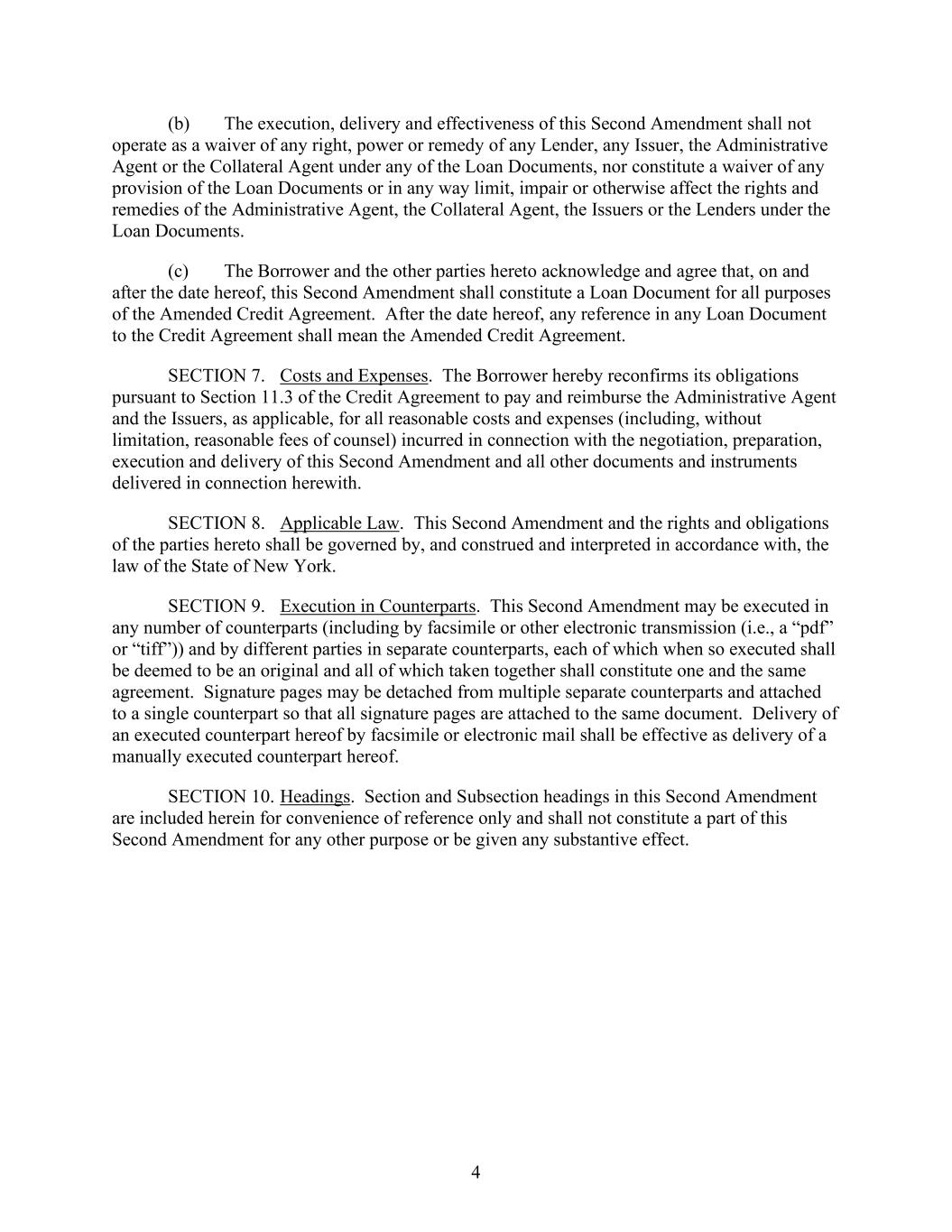 4 (b) The execution, delivery and effectiveness of this Second Amendment shall not operate as a waiver of any right, power or remedy of any Lender, any Issuer, the Administrative Agent or the Collateral Agent under any of the Loan Documents, nor constitute a waiver of any provision of the Loan Documents or in any way limit, impair or otherwise affect the rights and remedies of the Administrative Agent, the Collateral Agent, the Issuers or the Lenders under the Loan Documents. (c) The Borrower and the other parties hereto acknowledge and agree that, on and after the date hereof, this Second Amendment shall constitute a Loan Document for all purposes of the Amended Credit Agreement. After the date hereof, any reference in any Loan Document to the Credit Agreement shall mean the Amended Credit Agreement. SECTION 7. Costs and Expenses. The Borrower hereby reconfirms its obligations pursuant to Section 11.3 of the Credit Agreement to pay and reimburse the Administrative Agent and the Issuers, as applicable, for all reasonable costs and expenses (including, without limitation, reasonable fees of counsel) incurred in connection with the negotiation, preparation, execution and delivery of this Second Amendment and all other documents and instruments delivered in connection herewith. SECTION 8. Applicable Law. This Second Amendment and the rights and obligations of the parties hereto shall be governed by, and construed and interpreted in accordance with, the law of the State of New York. SECTION 9. Execution in Counterparts. This Second Amendment may be executed in any number of counterparts (including by facsimile or other electronic transmission (i.e., a “pdf” or “tiff”)) and by different parties in separate counterparts, each of which when so executed shall be deemed to be an original and all of which taken together shall constitute one and the same agreement. Signature pages may be detached from multiple separate counterparts and attached to a single counterpart so that all signature pages are attached to the same document. Delivery of an executed counterpart hereof by facsimile or electronic mail shall be effective as delivery of a manually executed counterpart hereof. SECTION 10. Headings. Section and Subsection headings in this Second Amendment are included herein for convenience of reference only and shall not constitute a part of this Second Amendment for any other purpose or be given any substantive effect.