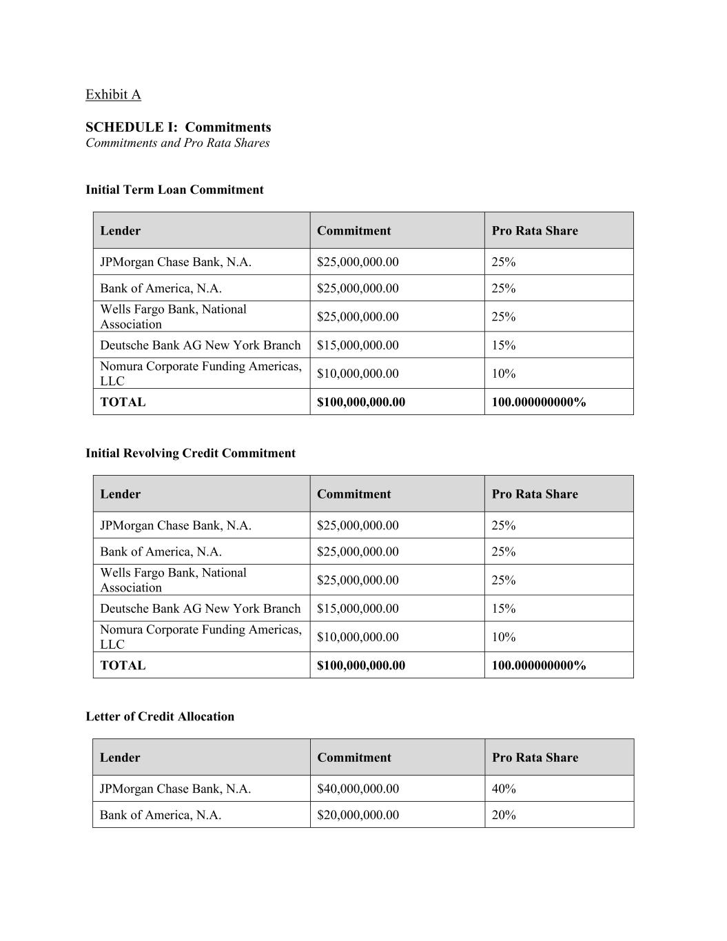 Exhibit A SCHEDULE I: Commitments Commitments and Pro Rata Shares Initial Term Loan Commitment Lender Commitment Pro Rata Share JPMorgan Chase Bank, N.A. $25,000,000.00 25% Bank of America, N.A. $25,000,000.00 25% Wells Fargo Bank, National Association $25,000,000.00 25% Deutsche Bank AG New York Branch $15,000,000.00 15% Nomura Corporate Funding Americas, LLC $10,000,000.00 10% TOTAL $100,000,000.00 100.000000000% Initial Revolving Credit Commitment Lender Commitment Pro Rata Share JPMorgan Chase Bank, N.A. $25,000,000.00 25% Bank of America, N.A. $25,000,000.00 25% Wells Fargo Bank, National Association $25,000,000.00 25% Deutsche Bank AG New York Branch $15,000,000.00 15% Nomura Corporate Funding Americas, LLC $10,000,000.00 10% TOTAL $100,000,000.00 100.000000000% Letter of Credit Allocation Lender Commitment Pro Rata Share JPMorgan Chase Bank, N.A. $40,000,000.00 40% Bank of America, N.A. $20,000,000.00 20%