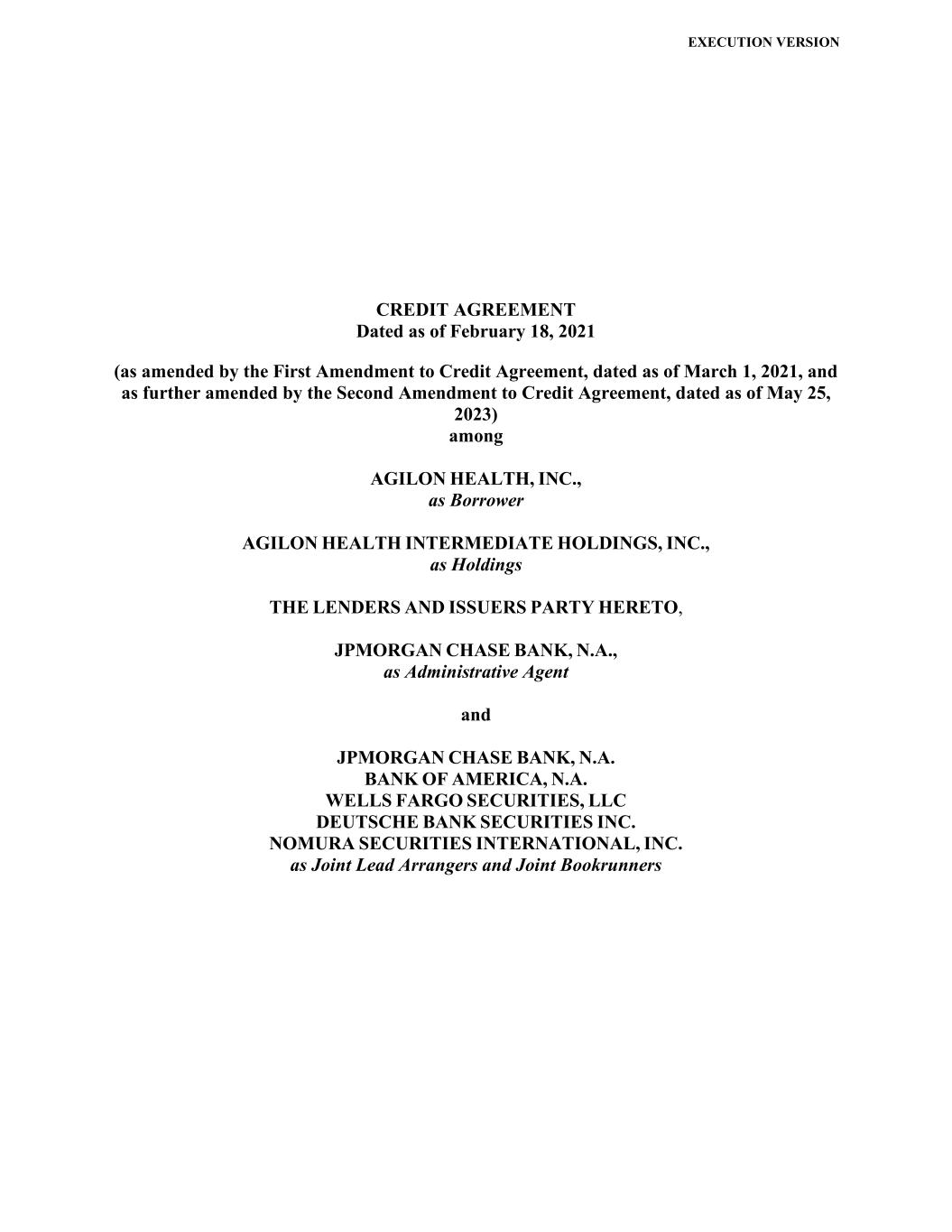 EXECUTION VERSION CREDIT AGREEMENT Dated as of February 18, 2021 (as amended by the First Amendment to Credit Agreement, dated as of March 1, 2021, and as further amended by the Second Amendment to Credit Agreement, dated as of May 25, 2023) among AGILON HEALTH, INC., as Borrower AGILON HEALTH INTERMEDIATE HOLDINGS, INC., as Holdings THE LENDERS AND ISSUERS PARTY HERETO, JPMORGAN CHASE BANK, N.A., as Administrative Agent and JPMORGAN CHASE BANK, N.A. BANK OF AMERICA, N.A. WELLS FARGO SECURITIES, LLC DEUTSCHE BANK SECURITIES INC. NOMURA SECURITIES INTERNATIONAL, INC. as Joint Lead Arrangers and Joint Bookrunners
