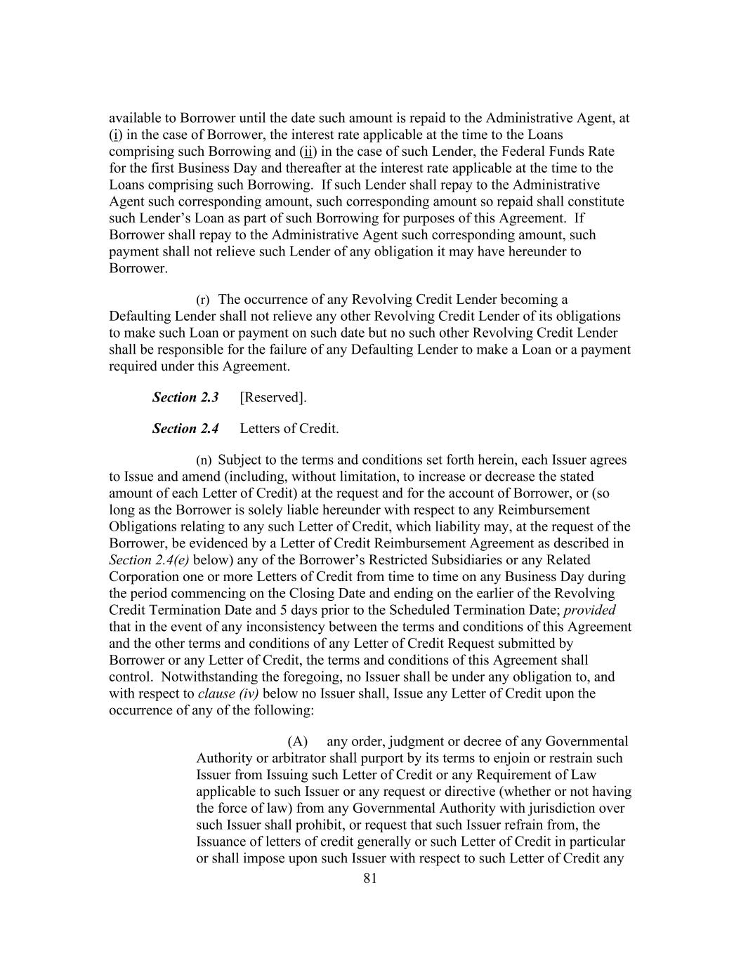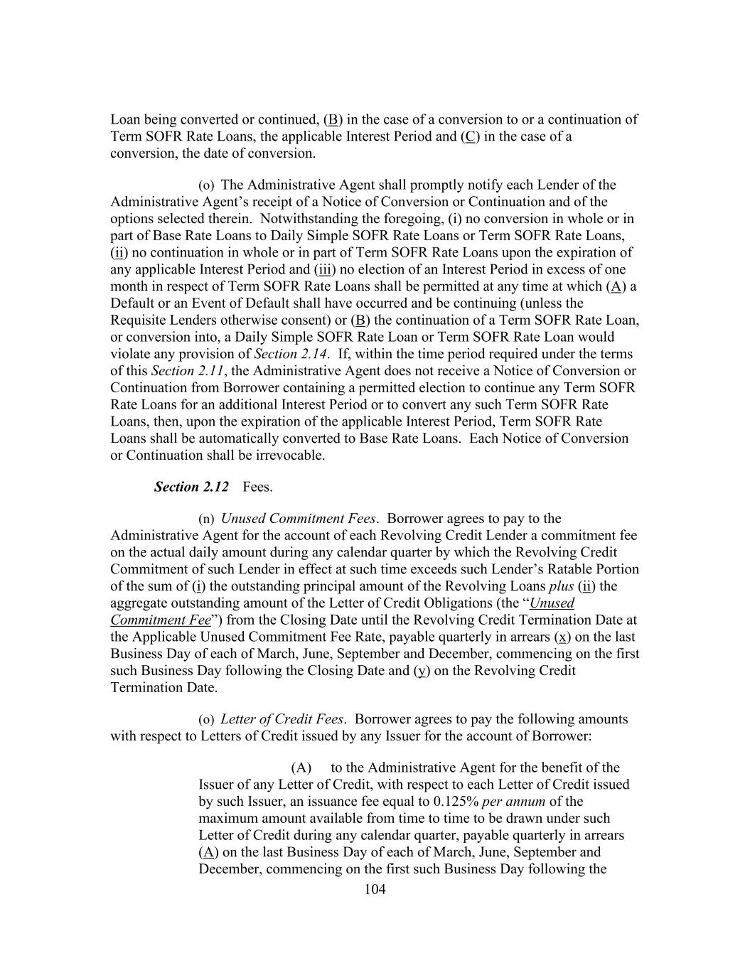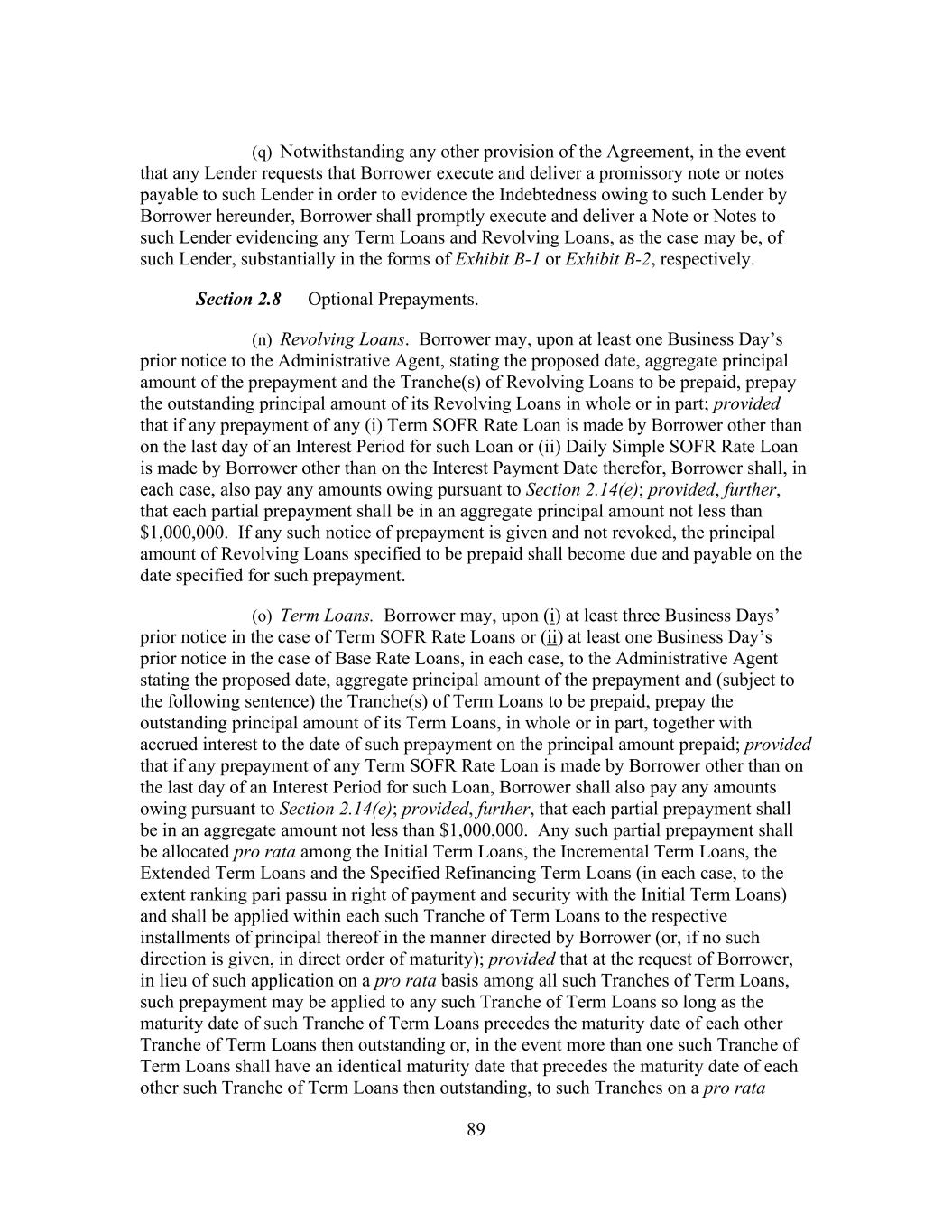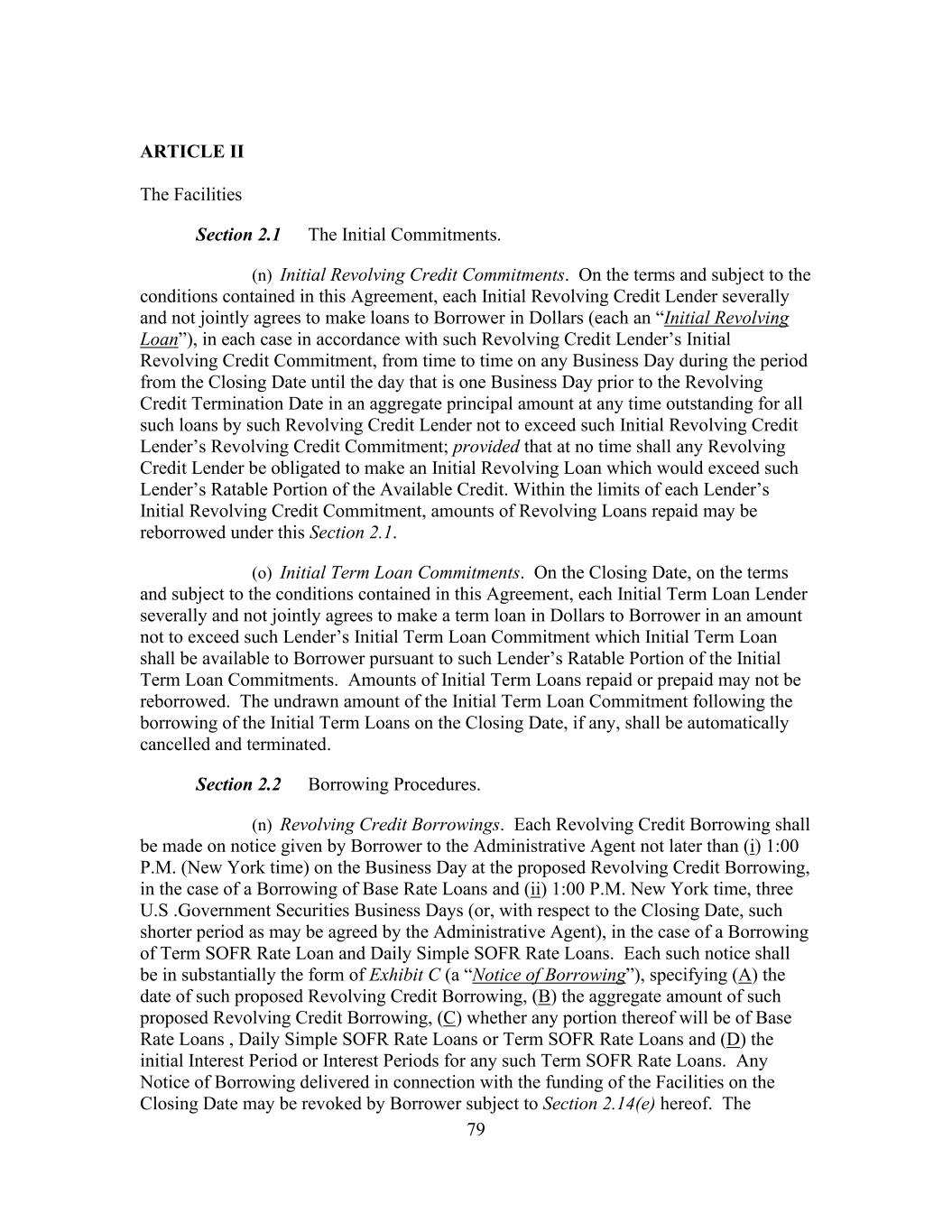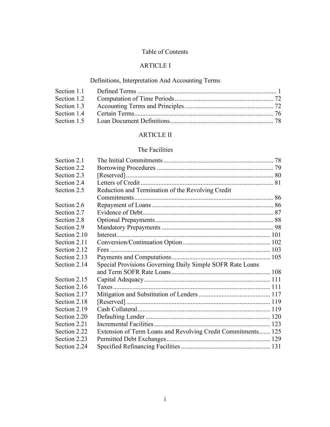 i Table of Contents ARTICLE I Definitions, Interpretation And Accounting Terms Section 1.1 Defined Terms ...................................................................................... 1 Section 1.2 Computation of Time Periods ............................................................. 72 Section 1.3 Accounting Terms and Principles ....................................................... 72 Section 1.4 Certain Terms...................................................................................... 76 Section 1.5 Loan Document Definitions ................................................................ 78 ARTICLE II The Facilities Section 2.1 The Initial Commitments .................................................................... 78 Section 2.2 Borrowing Procedures ........................................................................ 79 Section 2.3 [Reserved] ........................................................................................... 80 Section 2.4 Letters of Credit .................................................................................. 81 Section 2.5 Reduction and Termination of the Revolving Credit Commitments ...................................................................................... 86 Section 2.6 Repayment of Loans ........................................................................... 86 Section 2.7 Evidence of Debt................................................................................. 87 Section 2.8 Optional Prepayments ......................................................................... 88 Section 2.9 Mandatory Prepayments ..................................................................... 98 Section 2.10 Interest............................................................................................... 101 Section 2.11 Conversion/Continuation Option ...................................................... 102 Section 2.12 Fees ................................................................................................... 103 Section 2.13 Payments and Computations ............................................................. 105 Section 2.14 Special Provisions Governing Daily Simple SOFR Rate Loans and Term SOFR Rate Loans ............................................................. 108 Section 2.15 Capital Adequacy .............................................................................. 111 Section 2.16 Taxes ................................................................................................. 111 Section 2.17 Mitigation and Substitution of Lenders ............................................ 117 Section 2.18 [Reserved] ......................................................................................... 119 Section 2.19 Cash Collateral .................................................................................. 119 Section 2.20 Defaulting Lender ............................................................................. 120 Section 2.21 Incremental Facilities ........................................................................ 123 Section 2.22 Extension of Term Loans and Revolving Credit Commitments ....... 125 Section 2.23 Permitted Debt Exchanges ................................................................ 129 Section 2.24 Specified Refinancing Facilities ....................................................... 131