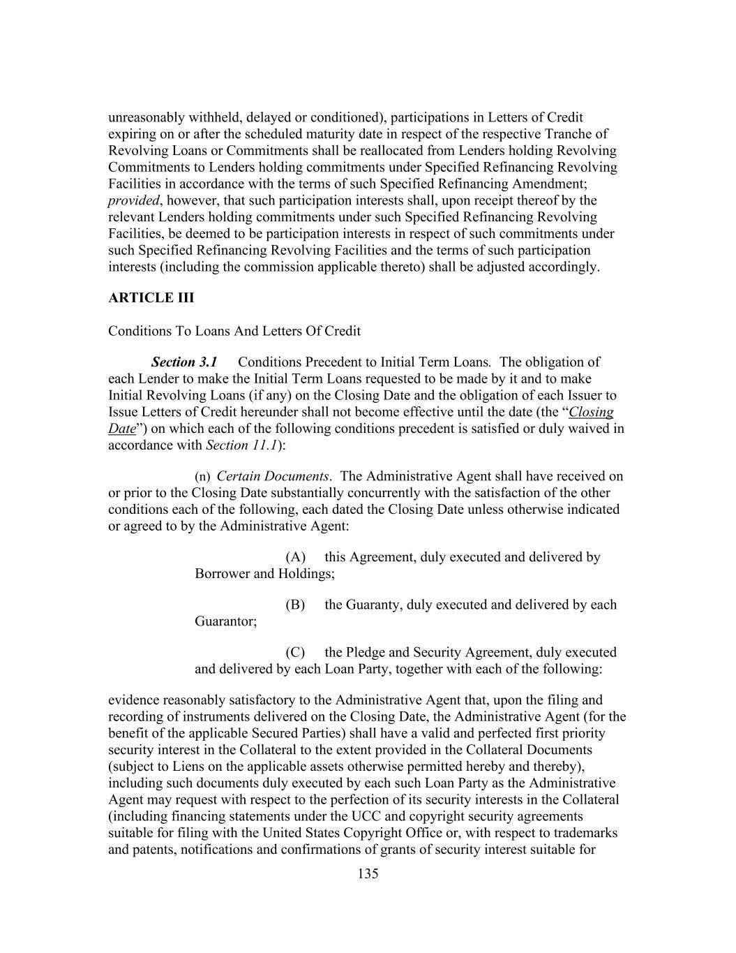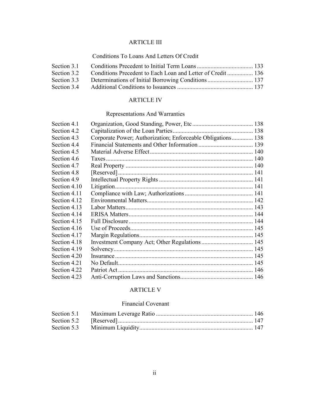 ii ARTICLE III Conditions To Loans And Letters Of Credit Section 3.1 Conditions Precedent to Initial Term Loans ..................................... 133 Section 3.2 Conditions Precedent to Each Loan and Letter of Credit ................. 136 Section 3.3 Determinations of Initial Borrowing Conditions .............................. 137 Section 3.4 Additional Conditions to Issuances .................................................. 137 ARTICLE IV Representations And Warranties Section 4.1 Organization, Good Standing, Power, Etc ........................................ 138 Section 4.2 Capitalization of the Loan Parties ..................................................... 138 Section 4.3 Corporate Power; Authorization; Enforceable Obligations .............. 138 Section 4.4 Financial Statements and Other Information .................................... 139 Section 4.5 Material Adverse Effect .................................................................... 140 Section 4.6 Taxes ................................................................................................. 140 Section 4.7 Real Property .................................................................................... 140 Section 4.8 [Reserved] ......................................................................................... 141 Section 4.9 Intellectual Property Rights .............................................................. 141 Section 4.10 Litigation ........................................................................................... 141 Section 4.11 Compliance with Law; Authorizations ............................................. 141 Section 4.12 Environmental Matters...................................................................... 142 Section 4.13 Labor Matters .................................................................................... 143 Section 4.14 ERISA Matters .................................................................................. 144 Section 4.15 Full Disclosure .................................................................................. 144 Section 4.16 Use of Proceeds................................................................................. 145 Section 4.17 Margin Regulations ........................................................................... 145 Section 4.18 Investment Company Act; Other Regulations .................................. 145 Section 4.19 Solvency ............................................................................................ 145 Section 4.20 Insurance ........................................................................................... 145 Section 4.21 No Default ......................................................................................... 145 Section 4.22 Patriot Act ......................................................................................... 146 Section 4.23 Anti-Corruption Laws and Sanctions................................................ 146 ARTICLE V Financial Covenant Section 5.1 Maximum Leverage Ratio ................................................................ 146 Section 5.2 [Reserved] ......................................................................................... 147 Section 5.3 Minimum Liquidity ........................................................................... 147