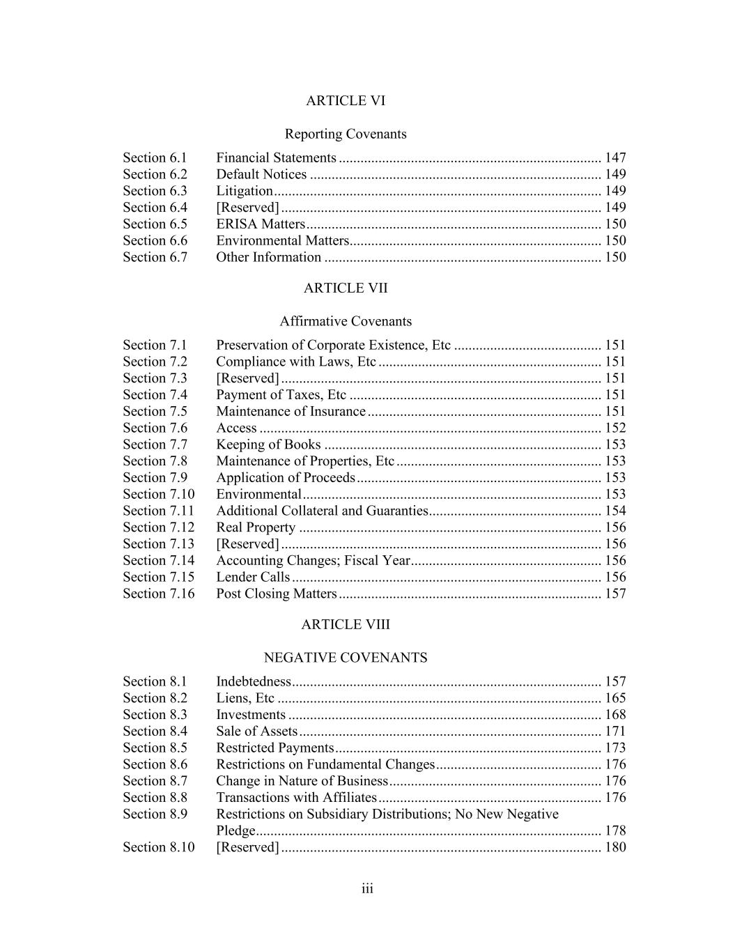 iii ARTICLE VI Reporting Covenants Section 6.1 Financial Statements ......................................................................... 147 Section 6.2 Default Notices ................................................................................. 149 Section 6.3 Litigation ........................................................................................... 149 Section 6.4 [Reserved] ......................................................................................... 149 Section 6.5 ERISA Matters .................................................................................. 150 Section 6.6 Environmental Matters...................................................................... 150 Section 6.7 Other Information ............................................................................. 150 ARTICLE VII Affirmative Covenants Section 7.1 Preservation of Corporate Existence, Etc ......................................... 151 Section 7.2 Compliance with Laws, Etc .............................................................. 151 Section 7.3 [Reserved] ......................................................................................... 151 Section 7.4 Payment of Taxes, Etc ...................................................................... 151 Section 7.5 Maintenance of Insurance ................................................................. 151 Section 7.6 Access ............................................................................................... 152 Section 7.7 Keeping of Books ............................................................................. 153 Section 7.8 Maintenance of Properties, Etc ......................................................... 153 Section 7.9 Application of Proceeds .................................................................... 153 Section 7.10 Environmental ................................................................................... 153 Section 7.11 Additional Collateral and Guaranties ................................................ 154 Section 7.12 Real Property .................................................................................... 156 Section 7.13 [Reserved] ......................................................................................... 156 Section 7.14 Accounting Changes; Fiscal Year ..................................................... 156 Section 7.15 Lender Calls ...................................................................................... 156 Section 7.16 Post Closing Matters ......................................................................... 157 ARTICLE VIII NEGATIVE COVENANTS Section 8.1 Indebtedness ...................................................................................... 157 Section 8.2 Liens, Etc .......................................................................................... 165 Section 8.3 Investments ....................................................................................... 168 Section 8.4 Sale of Assets .................................................................................... 171 Section 8.5 Restricted Payments .......................................................................... 173 Section 8.6 Restrictions on Fundamental Changes .............................................. 176 Section 8.7 Change in Nature of Business ........................................................... 176 Section 8.8 Transactions with Affiliates .............................................................. 176 Section 8.9 Restrictions on Subsidiary Distributions; No New Negative Pledge ................................................................................................ 178 Section 8.10 [Reserved] ......................................................................................... 180