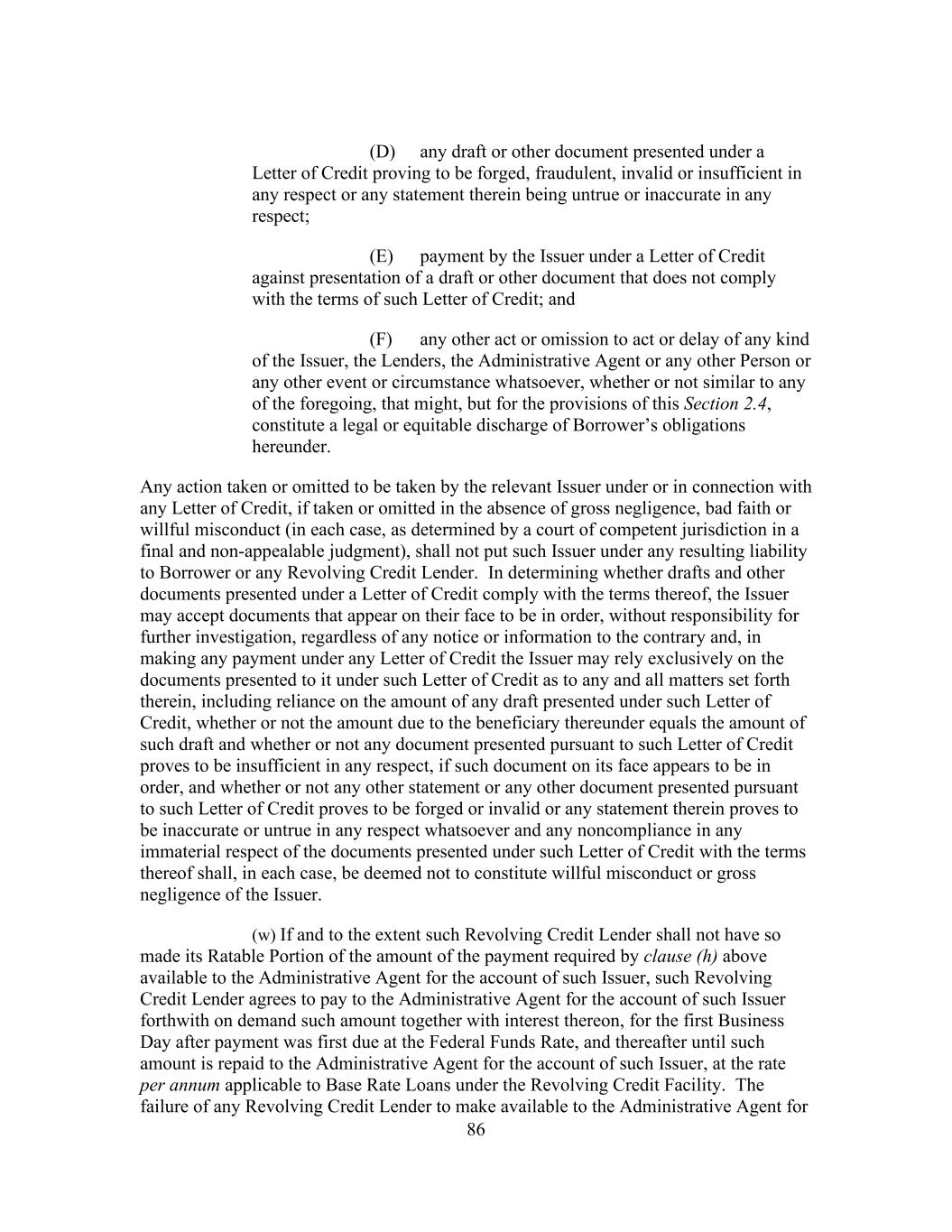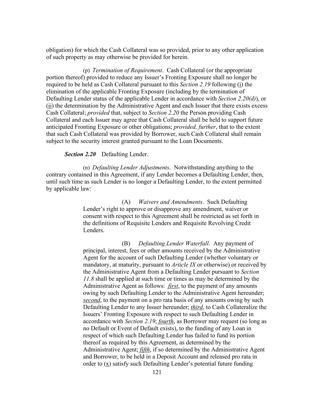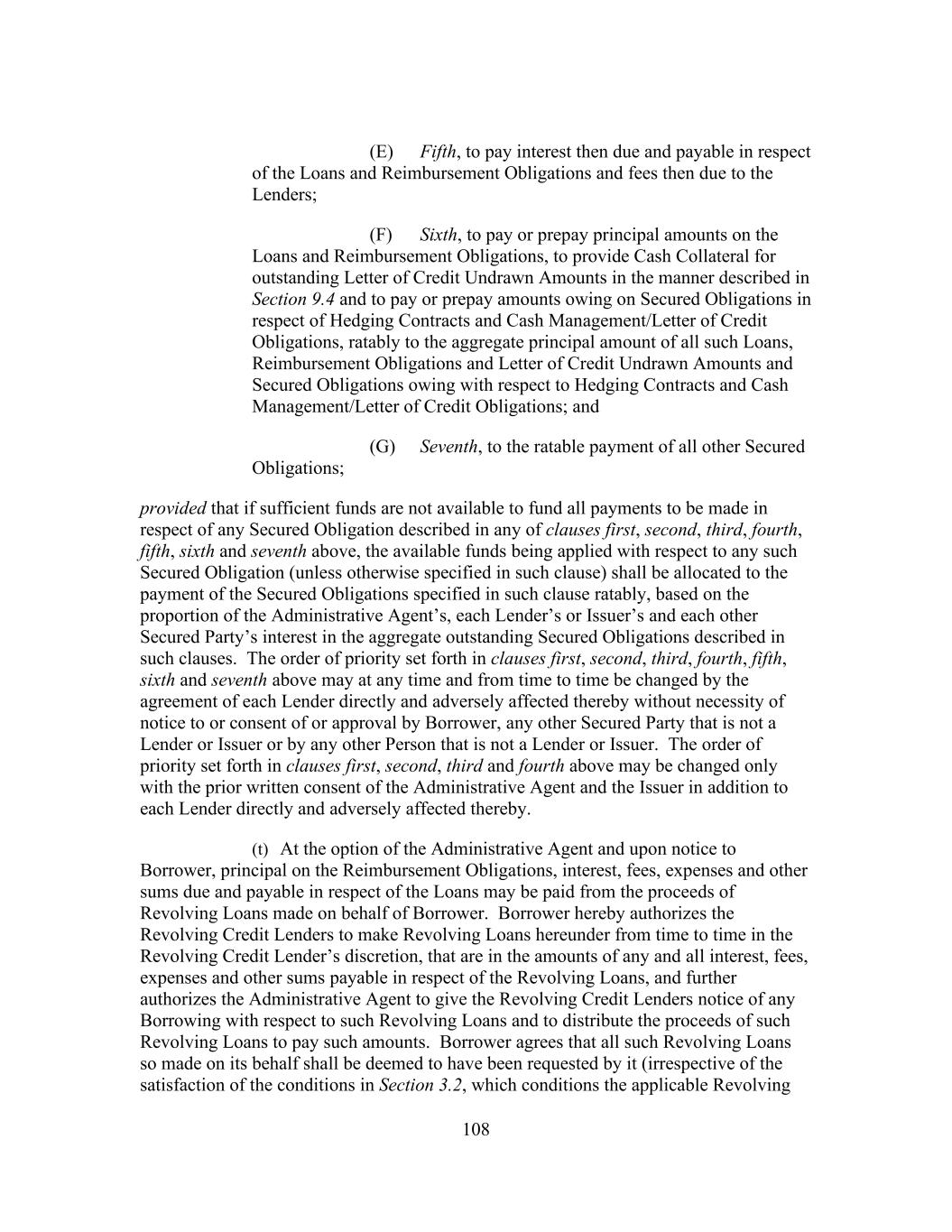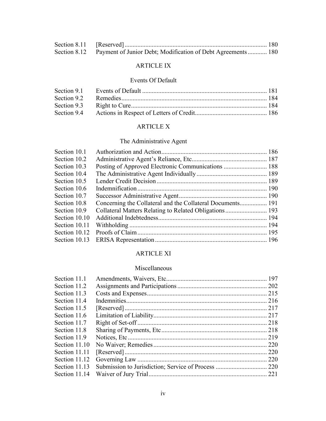 iv Section 8.11 [Reserved] ......................................................................................... 180 Section 8.12 Payment of Junior Debt; Modification of Debt Agreements ............ 180 ARTICLE IX Events Of Default Section 9.1 Events of Default .............................................................................. 181 Section 9.2 Remedies ........................................................................................... 184 Section 9.3 Right to Cure ..................................................................................... 184 Section 9.4 Actions in Respect of Letters of Credit............................................. 186 ARTICLE X The Administrative Agent Section 10.1 Authorization and Action .................................................................. 186 Section 10.2 Administrative Agent’s Reliance, Etc............................................... 187 Section 10.3 Posting of Approved Electronic Communications ........................... 188 Section 10.4 The Administrative Agent Individually ............................................ 189 Section 10.5 Lender Credit Decision ..................................................................... 189 Section 10.6 Indemnification ................................................................................. 190 Section 10.7 Successor Administrative Agent ....................................................... 190 Section 10.8 Concerning the Collateral and the Collateral Documents ................. 191 Section 10.9 Collateral Matters Relating to Related Obligations .......................... 193 Section 10.10 Additional Indebtedness.................................................................... 194 Section 10.11 Withholding ...................................................................................... 194 Section 10.12 Proofs of Claim ................................................................................. 195 Section 10.13 ERISA Representation ...................................................................... 196 ARTICLE XI Miscellaneous Section 11.1 Amendments, Waivers, Etc ............................................................... 197 Section 11.2 Assignments and Participations ........................................................ 202 Section 11.3 Costs and Expenses ........................................................................... 215 Section 11.4 Indemnities ........................................................................................ 216 Section 11.5 [Reserved] ......................................................................................... 217 Section 11.6 Limitation of Liability....................................................................... 217 Section 11.7 Right of Set-off ................................................................................. 218 Section 11.8 Sharing of Payments, Etc .................................................................. 218 Section 11.9 Notices, Etc ....................................................................................... 219 Section 11.10 No Waiver; Remedies ....................................................................... 220 Section 11.11 [Reserved] ......................................................................................... 220 Section 11.12 Governing Law ................................................................................. 220 Section 11.13 Submission to Jurisdiction; Service of Process ................................ 220 Section 11.14 Waiver of Jury Trial .......................................................................... 221