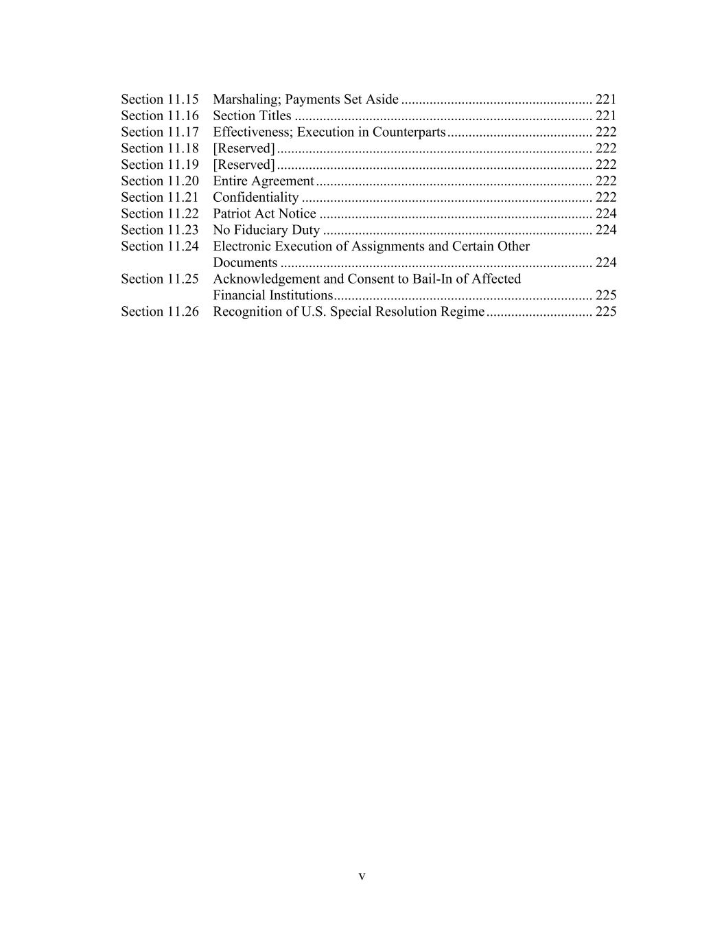 v Section 11.15 Marshaling; Payments Set Aside ...................................................... 221 Section 11.16 Section Titles .................................................................................... 221 Section 11.17 Effectiveness; Execution in Counterparts ......................................... 222 Section 11.18 [Reserved] ......................................................................................... 222 Section 11.19 [Reserved] ......................................................................................... 222 Section 11.20 Entire Agreement .............................................................................. 222 Section 11.21 Confidentiality .................................................................................. 222 Section 11.22 Patriot Act Notice ............................................................................. 224 Section 11.23 No Fiduciary Duty ............................................................................ 224 Section 11.24 Electronic Execution of Assignments and Certain Other Documents ........................................................................................ 224 Section 11.25 Acknowledgement and Consent to Bail-In of Affected Financial Institutions ......................................................................... 225 Section 11.26 Recognition of U.S. Special Resolution Regime .............................. 225