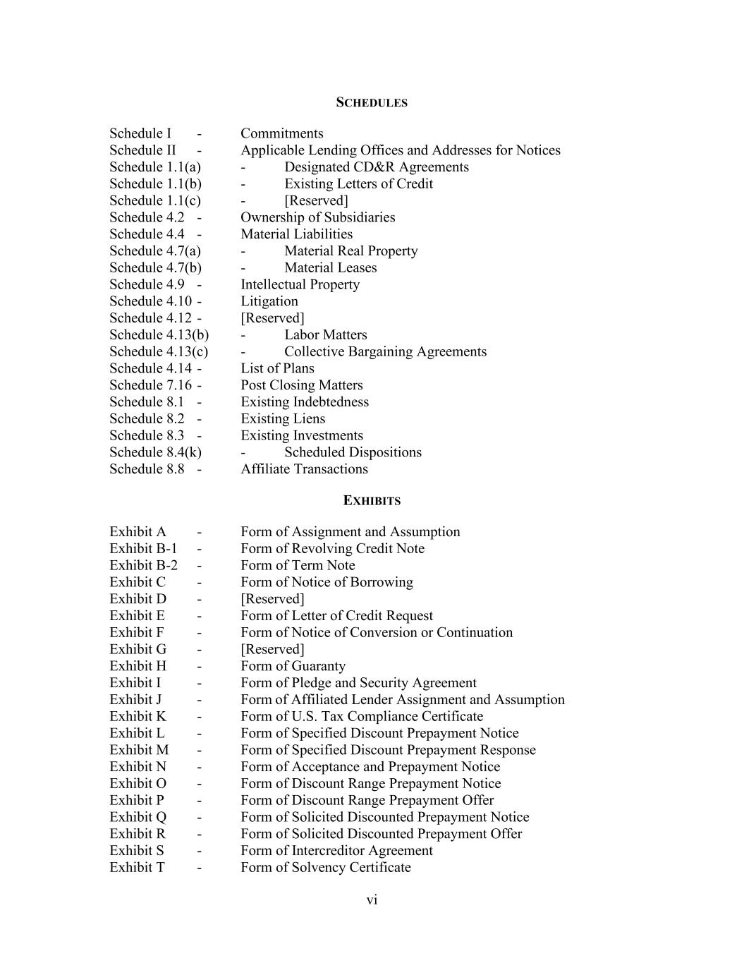 vi SCHEDULES Schedule I - Commitments Schedule II - Applicable Lending Offices and Addresses for Notices Schedule 1.1(a) - Designated CD&R Agreements Schedule 1.1(b) - Existing Letters of Credit Schedule 1.1(c) - [Reserved] Schedule 4.2 - Ownership of Subsidiaries Schedule 4.4 - Material Liabilities Schedule 4.7(a) - Material Real Property Schedule 4.7(b) - Material Leases Schedule 4.9 - Intellectual Property Schedule 4.10 - Litigation Schedule 4.12 - [Reserved] Schedule 4.13(b) - Labor Matters Schedule 4.13(c) - Collective Bargaining Agreements Schedule 4.14 - List of Plans Schedule 7.16 - Post Closing Matters Schedule 8.1 - Existing Indebtedness Schedule 8.2 - Existing Liens Schedule 8.3 - Existing Investments Schedule 8.4(k) - Scheduled Dispositions Schedule 8.8 - Affiliate Transactions EXHIBITS Exhibit A - Form of Assignment and Assumption Exhibit B-1 - Form of Revolving Credit Note Exhibit B-2 - Form of Term Note Exhibit C - Form of Notice of Borrowing Exhibit D - [Reserved] Exhibit E - Form of Letter of Credit Request Exhibit F - Form of Notice of Conversion or Continuation Exhibit G - [Reserved] Exhibit H - Form of Guaranty Exhibit I - Form of Pledge and Security Agreement Exhibit J - Form of Affiliated Lender Assignment and Assumption Exhibit K - Form of U.S. Tax Compliance Certificate Exhibit L - Form of Specified Discount Prepayment Notice Exhibit M - Form of Specified Discount Prepayment Response Exhibit N - Form of Acceptance and Prepayment Notice Exhibit O - Form of Discount Range Prepayment Notice Exhibit P - Form of Discount Range Prepayment Offer Exhibit Q - Form of Solicited Discounted Prepayment Notice Exhibit R - Form of Solicited Discounted Prepayment Offer Exhibit S - Form of Intercreditor Agreement Exhibit T - Form of Solvency Certificate