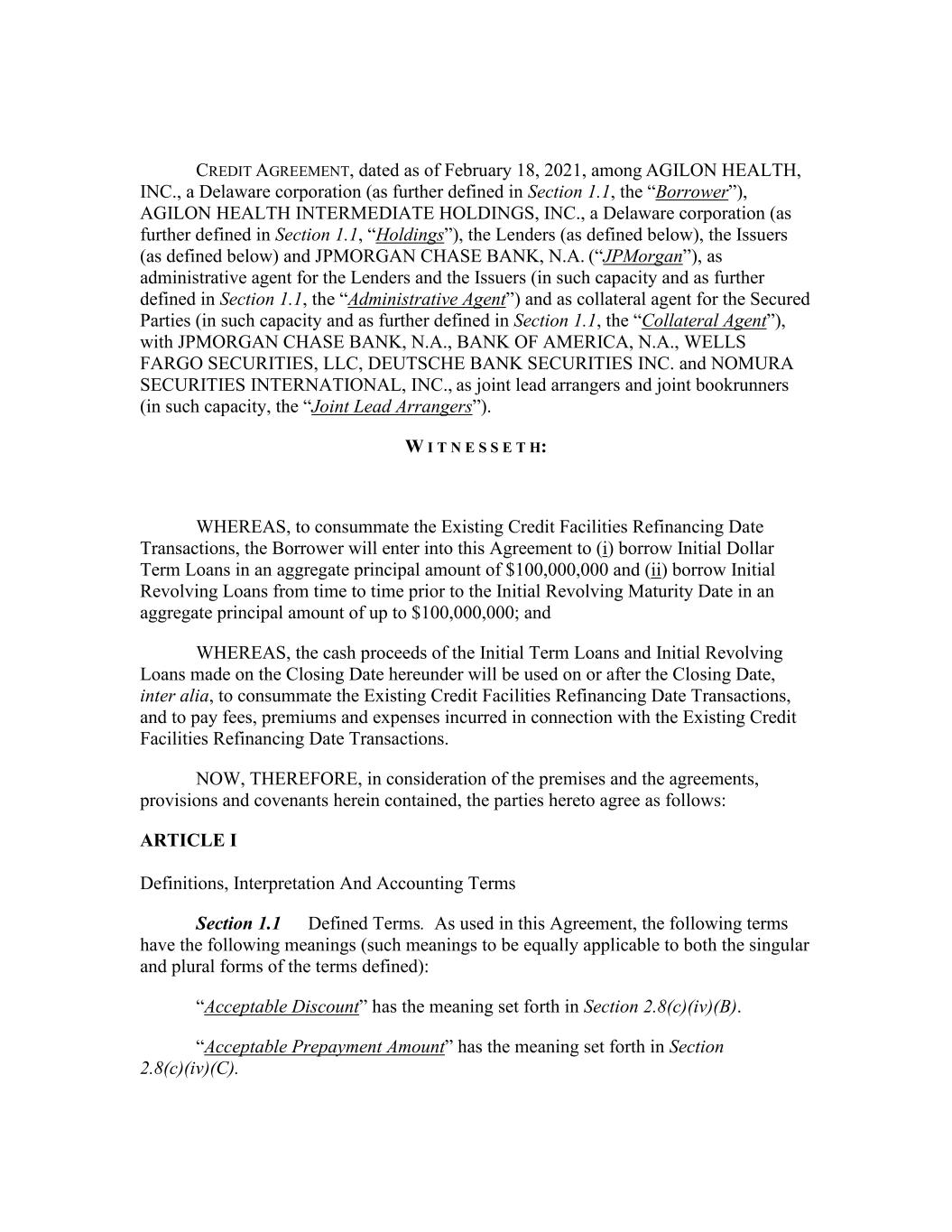 CREDIT AGREEMENT, dated as of February 18, 2021, among AGILON HEALTH, INC., a Delaware corporation (as further defined in Section 1.1, the “Borrower”), AGILON HEALTH INTERMEDIATE HOLDINGS, INC., a Delaware corporation (as further defined in Section 1.1, “Holdings”), the Lenders (as defined below), the Issuers (as defined below) and JPMORGAN CHASE BANK, N.A. (“JPMorgan”), as administrative agent for the Lenders and the Issuers (in such capacity and as further defined in Section 1.1, the “Administrative Agent”) and as collateral agent for the Secured Parties (in such capacity and as further defined in Section 1.1, the “Collateral Agent”), with JPMORGAN CHASE BANK, N.A., BANK OF AMERICA, N.A., WELLS FARGO SECURITIES, LLC, DEUTSCHE BANK SECURITIES INC. and NOMURA SECURITIES INTERNATIONAL, INC., as joint lead arrangers and joint bookrunners (in such capacity, the “Joint Lead Arrangers”). W I T N E S S E T H: WHEREAS, to consummate the Existing Credit Facilities Refinancing Date Transactions, the Borrower will enter into this Agreement to (i) borrow Initial Dollar Term Loans in an aggregate principal amount of $100,000,000 and (ii) borrow Initial Revolving Loans from time to time prior to the Initial Revolving Maturity Date in an aggregate principal amount of up to $100,000,000; and WHEREAS, the cash proceeds of the Initial Term Loans and Initial Revolving Loans made on the Closing Date hereunder will be used on or after the Closing Date, inter alia, to consummate the Existing Credit Facilities Refinancing Date Transactions, and to pay fees, premiums and expenses incurred in connection with the Existing Credit Facilities Refinancing Date Transactions. NOW, THEREFORE, in consideration of the premises and the agreements, provisions and covenants herein contained, the parties hereto agree as follows: ARTICLE I Definitions, Interpretation And Accounting Terms Section 1.1 Defined Terms. As used in this Agreement, the following terms have the following meanings (such meanings to be equally applicable to both the singular and plural forms of the terms defined): “Acceptable Discount” has the meaning set forth in Section 2.8(c)(iv)(B). “Acceptable Prepayment Amount” has the meaning set forth in Section 2.8(c)(iv)(C).