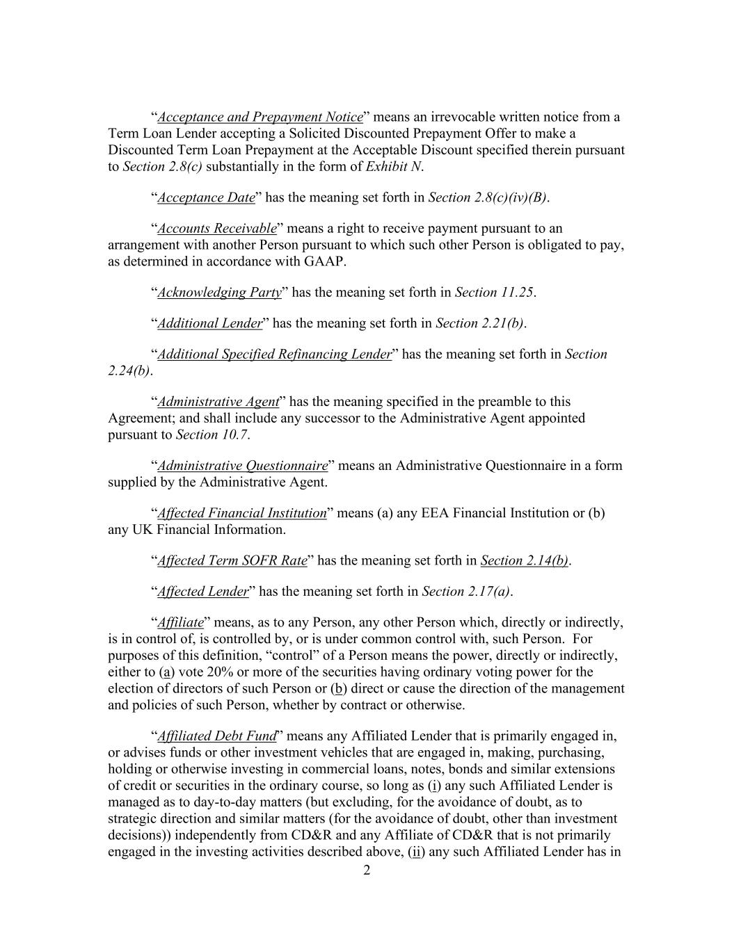 2 “Acceptance and Prepayment Notice” means an irrevocable written notice from a Term Loan Lender accepting a Solicited Discounted Prepayment Offer to make a Discounted Term Loan Prepayment at the Acceptable Discount specified therein pursuant to Section 2.8(c) substantially in the form of Exhibit N. “Acceptance Date” has the meaning set forth in Section 2.8(c)(iv)(B). “Accounts Receivable” means a right to receive payment pursuant to an arrangement with another Person pursuant to which such other Person is obligated to pay, as determined in accordance with GAAP. “Acknowledging Party” has the meaning set forth in Section 11.25. “Additional Lender” has the meaning set forth in Section 2.21(b). “Additional Specified Refinancing Lender” has the meaning set forth in Section 2.24(b). “Administrative Agent” has the meaning specified in the preamble to this Agreement; and shall include any successor to the Administrative Agent appointed pursuant to Section 10.7. “Administrative Questionnaire” means an Administrative Questionnaire in a form supplied by the Administrative Agent. “Affected Financial Institution” means (a) any EEA Financial Institution or (b) any UK Financial Information. “Affected Term SOFR Rate” has the meaning set forth in Section 2.14(b). “Affected Lender” has the meaning set forth in Section 2.17(a). “Affiliate” means, as to any Person, any other Person which, directly or indirectly, is in control of, is controlled by, or is under common control with, such Person. For purposes of this definition, “control” of a Person means the power, directly or indirectly, either to (a) vote 20% or more of the securities having ordinary voting power for the election of directors of such Person or (b) direct or cause the direction of the management and policies of such Person, whether by contract or otherwise. “Affiliated Debt Fund” means any Affiliated Lender that is primarily engaged in, or advises funds or other investment vehicles that are engaged in, making, purchasing, holding or otherwise investing in commercial loans, notes, bonds and similar extensions of credit or securities in the ordinary course, so long as (i) any such Affiliated Lender is managed as to day-to-day matters (but excluding, for the avoidance of doubt, as to strategic direction and similar matters (for the avoidance of doubt, other than investment decisions)) independently from CD&R and any Affiliate of CD&R that is not primarily engaged in the investing activities described above, (ii) any such Affiliated Lender has in