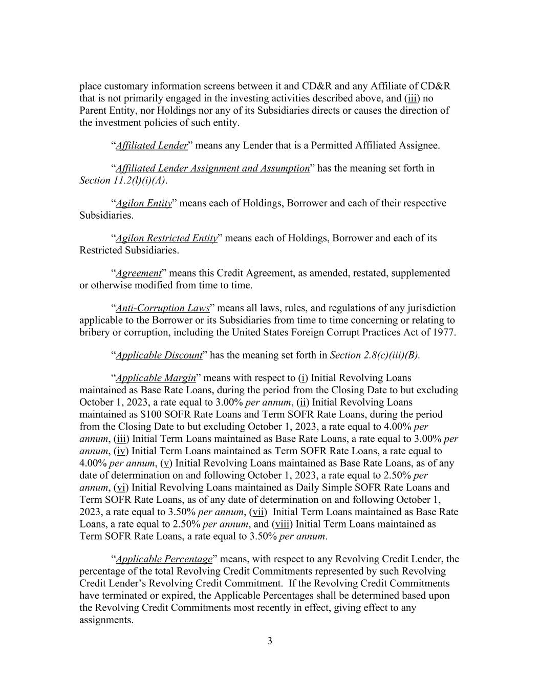 3 place customary information screens between it and CD&R and any Affiliate of CD&R that is not primarily engaged in the investing activities described above, and (iii) no Parent Entity, nor Holdings nor any of its Subsidiaries directs or causes the direction of the investment policies of such entity. “Affiliated Lender” means any Lender that is a Permitted Affiliated Assignee. “Affiliated Lender Assignment and Assumption” has the meaning set forth in Section 11.2(l)(i)(A). “Agilon Entity” means each of Holdings, Borrower and each of their respective Subsidiaries. “Agilon Restricted Entity” means each of Holdings, Borrower and each of its Restricted Subsidiaries. “Agreement” means this Credit Agreement, as amended, restated, supplemented or otherwise modified from time to time. “Anti-Corruption Laws” means all laws, rules, and regulations of any jurisdiction applicable to the Borrower or its Subsidiaries from time to time concerning or relating to bribery or corruption, including the United States Foreign Corrupt Practices Act of 1977. “Applicable Discount” has the meaning set forth in Section 2.8(c)(iii)(B). “Applicable Margin” means with respect to (i) Initial Revolving Loans maintained as Base Rate Loans, during the period from the Closing Date to but excluding October 1, 2023, a rate equal to 3.00% per annum, (ii) Initial Revolving Loans maintained as $100 SOFR Rate Loans and Term SOFR Rate Loans, during the period from the Closing Date to but excluding October 1, 2023, a rate equal to 4.00% per annum, (iii) Initial Term Loans maintained as Base Rate Loans, a rate equal to 3.00% per annum, (iv) Initial Term Loans maintained as Term SOFR Rate Loans, a rate equal to 4.00% per annum, (v) Initial Revolving Loans maintained as Base Rate Loans, as of any date of determination on and following October 1, 2023, a rate equal to 2.50% per annum, (vi) Initial Revolving Loans maintained as Daily Simple SOFR Rate Loans and Term SOFR Rate Loans, as of any date of determination on and following October 1, 2023, a rate equal to 3.50% per annum, (vii) Initial Term Loans maintained as Base Rate Loans, a rate equal to 2.50% per annum, and (viii) Initial Term Loans maintained as Term SOFR Rate Loans, a rate equal to 3.50% per annum. “Applicable Percentage” means, with respect to any Revolving Credit Lender, the percentage of the total Revolving Credit Commitments represented by such Revolving Credit Lender’s Revolving Credit Commitment. If the Revolving Credit Commitments have terminated or expired, the Applicable Percentages shall be determined based upon the Revolving Credit Commitments most recently in effect, giving effect to any assignments.