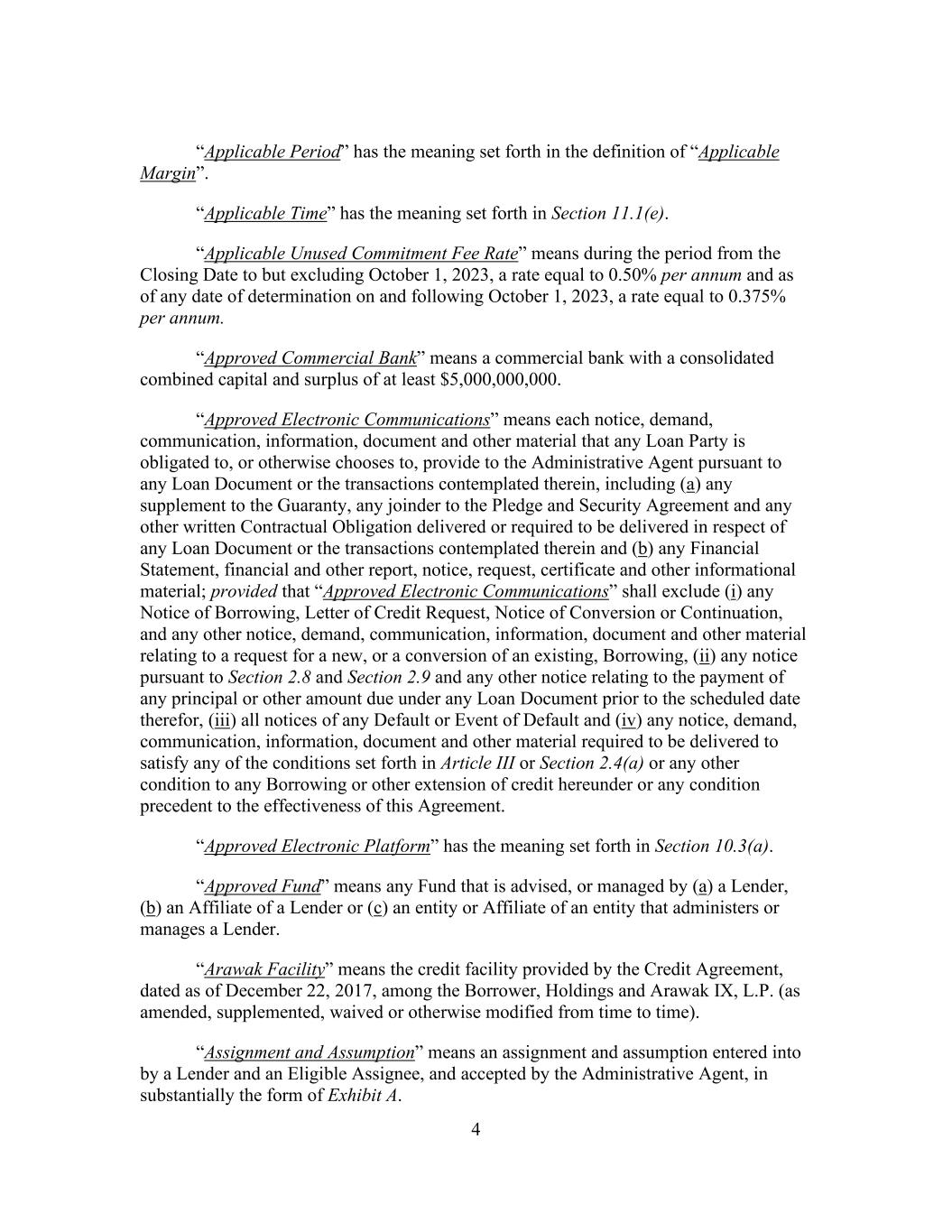 4 “Applicable Period” has the meaning set forth in the definition of “Applicable Margin”. “Applicable Time” has the meaning set forth in Section 11.1(e). “Applicable Unused Commitment Fee Rate” means during the period from the Closing Date to but excluding October 1, 2023, a rate equal to 0.50% per annum and as of any date of determination on and following October 1, 2023, a rate equal to 0.375% per annum. “Approved Commercial Bank” means a commercial bank with a consolidated combined capital and surplus of at least $5,000,000,000. “Approved Electronic Communications” means each notice, demand, communication, information, document and other material that any Loan Party is obligated to, or otherwise chooses to, provide to the Administrative Agent pursuant to any Loan Document or the transactions contemplated therein, including (a) any supplement to the Guaranty, any joinder to the Pledge and Security Agreement and any other written Contractual Obligation delivered or required to be delivered in respect of any Loan Document or the transactions contemplated therein and (b) any Financial Statement, financial and other report, notice, request, certificate and other informational material; provided that “Approved Electronic Communications” shall exclude (i) any Notice of Borrowing, Letter of Credit Request, Notice of Conversion or Continuation, and any other notice, demand, communication, information, document and other material relating to a request for a new, or a conversion of an existing, Borrowing, (ii) any notice pursuant to Section 2.8 and Section 2.9 and any other notice relating to the payment of any principal or other amount due under any Loan Document prior to the scheduled date therefor, (iii) all notices of any Default or Event of Default and (iv) any notice, demand, communication, information, document and other material required to be delivered to satisfy any of the conditions set forth in Article III or Section 2.4(a) or any other condition to any Borrowing or other extension of credit hereunder or any condition precedent to the effectiveness of this Agreement. “Approved Electronic Platform” has the meaning set forth in Section 10.3(a). “Approved Fund” means any Fund that is advised, or managed by (a) a Lender, (b) an Affiliate of a Lender or (c) an entity or Affiliate of an entity that administers or manages a Lender. “Arawak Facility” means the credit facility provided by the Credit Agreement, dated as of December 22, 2017, among the Borrower, Holdings and Arawak IX, L.P. (as amended, supplemented, waived or otherwise modified from time to time). “Assignment and Assumption” means an assignment and assumption entered into by a Lender and an Eligible Assignee, and accepted by the Administrative Agent, in substantially the form of Exhibit A.